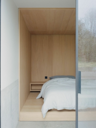 Inside, black steel finishes and seamless concrete floors contrast with the exposed timber structure and window frames. Oak is used to ‘wrap’ the interior of the extension, including the walls, doors and joinery, creating a sense of intimacy and calmness, in contrast to the open-plan nature of the existing barns.