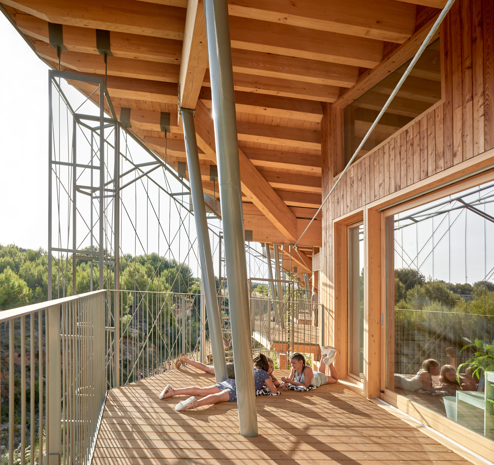 Located between residential buildings and the En Dolça ravine in the municipality of Paterna, near Valencia, Gradolí & Sanz Arquitectes’ Imagine Montessori School is conceived as an extension of the surrounding landscape. Rather than orienting itself toward the city, the school opens up toward the ravine, prioritising the natural environment. Children arrive via raised timber walkways through a pine forest, gradually transitioning into the school without gates or abrupt thresholds.