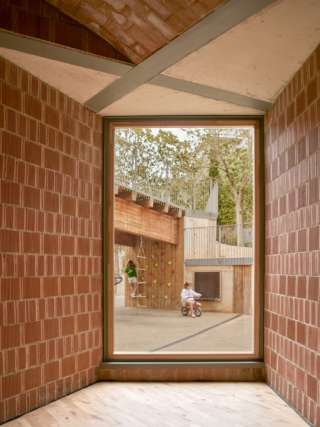 Clay brick loadbearing walls and vaults define the main school structure, with timber used for partitions, roofing, and joinery. Concrete is limited to the foundations, and steel appears only in select columns and handrails. There are no suspended ceilings or applied finishes. Mechanical and electrical systems remain exposed, encouraging pupils to learn how the building functions. A sloping green roof blends into the perimeter landscape and provides thermal insulation.