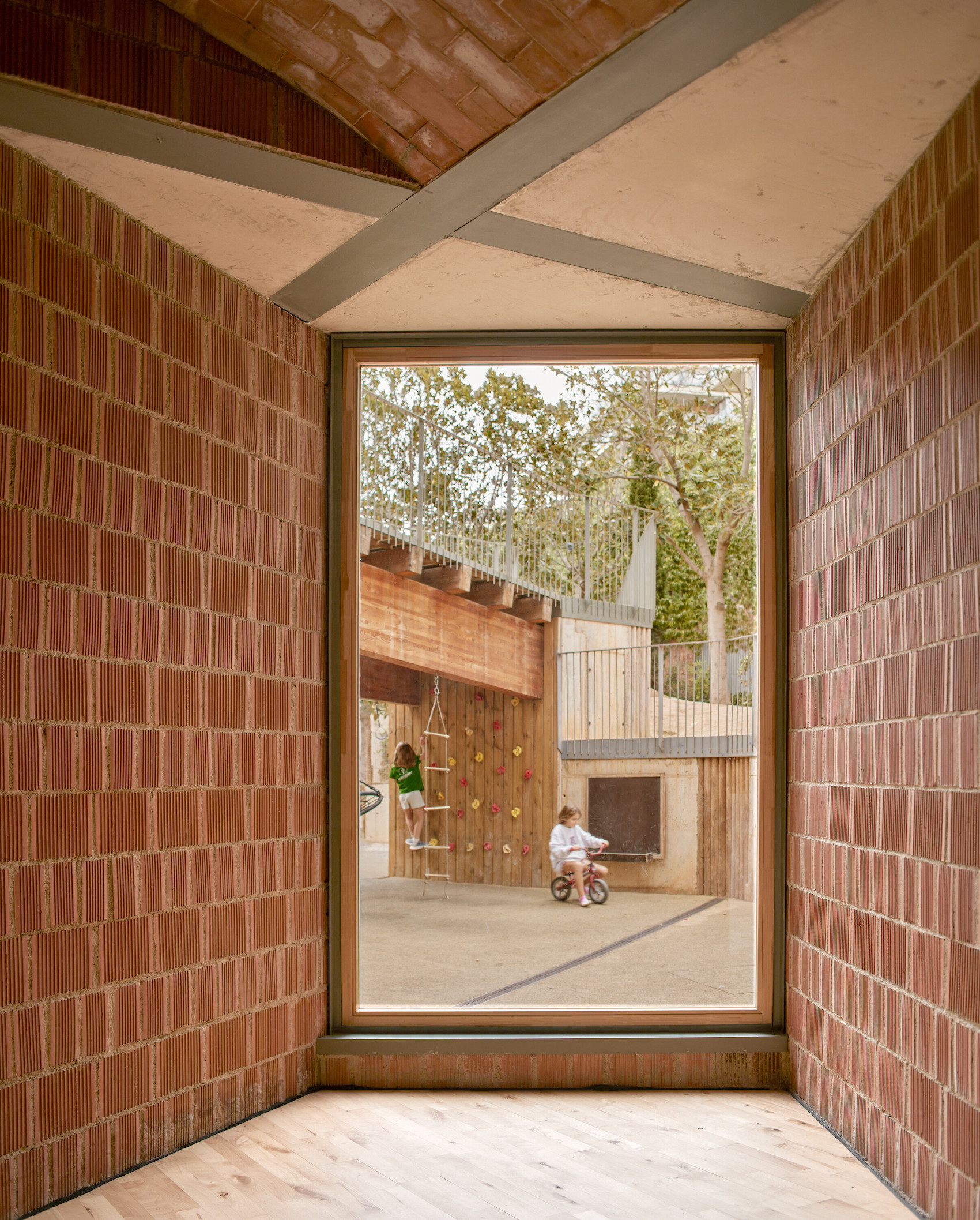 Every classroom opens onto an outdoor area that includes a covered terrace, water fountain, small amphitheatre, and a deciduous tree, which becomes a seasonal teaching tool. Shared circulation areas are widened to create spaces for working, playing and gathering, including balconies and walkways that overlook the landscape. Loft spaces above bathrooms, nooks beneath stairs, and floor-level windows create moments of seclusion and delight for the pupils. These micro-environments are deliberately scaled for children and largely inaccessible to adults.