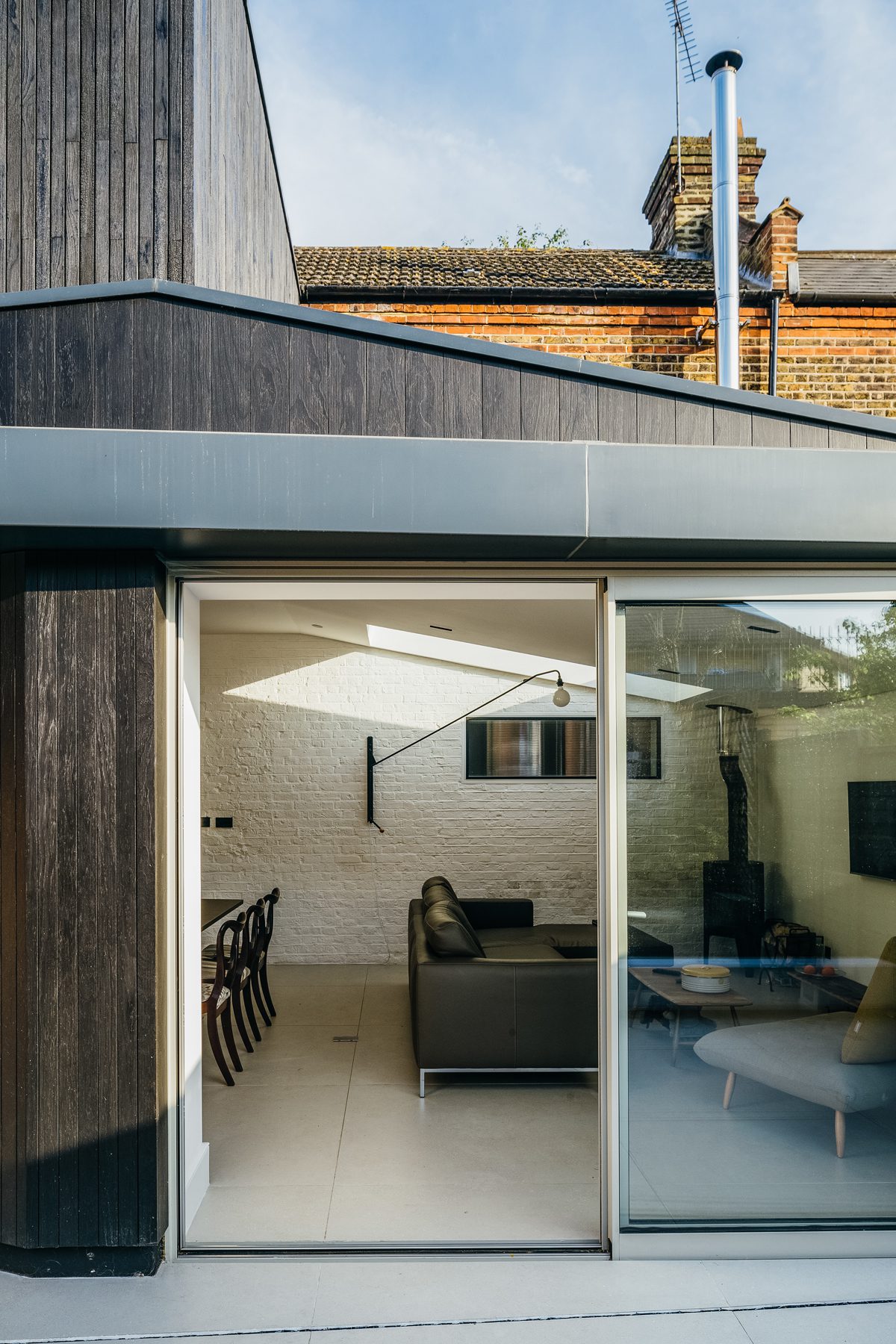 The Black Ridge House is a newly-extended three-bedroom Victorian terraced house on the Warner Estate, an early twentieth-century suburban housing development in Walthamstow, north London. Neil Dusheiko Architects’ two-storey rear addition creates an open-plan kitchen, dining and living area on the ground floor and an en-suite master bedroom on the first floor. The project incorporates many energy-saving features, including a high standard of insulation, robust airtight detailing, underfloor heating in the extension, extensive skylights and highly-insulated Schueco doubled-glazed metal windows. The design of the extension was inspired by the roof lines and rhythm of the Warner houses. The building form responds to various site constraints, with the roof line respectful of the neighbouring properties. The black-stained timber extension contrasts with the Victorian brickwork so that the two elements of the house are distinct.