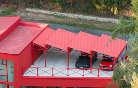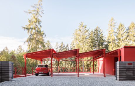 Access is from the upper level, where a roof terrace accommodates parking beneath a distinctive sawtooth canopy formed from red-painted steel. The entrance is integrated into the roofscape and leads into a central hall where views of the forest are revealed through large, irregularly-divided windows.