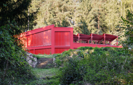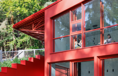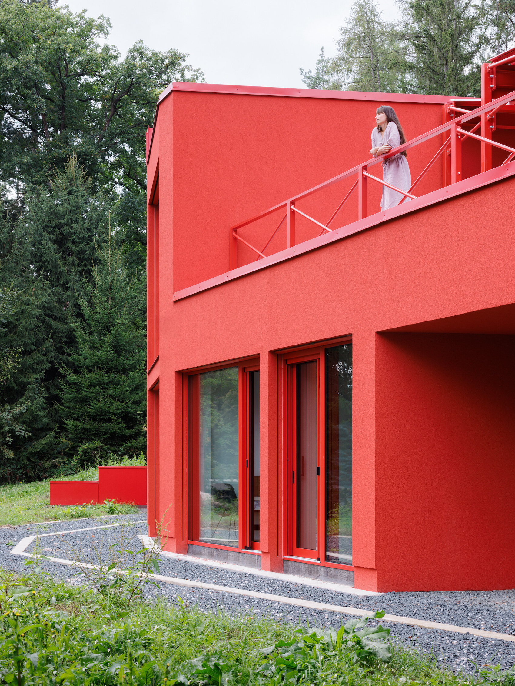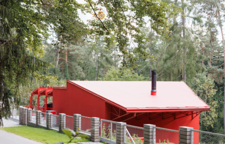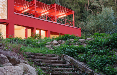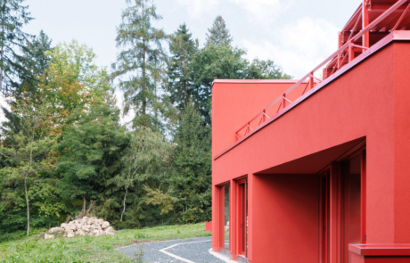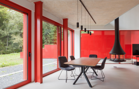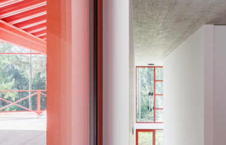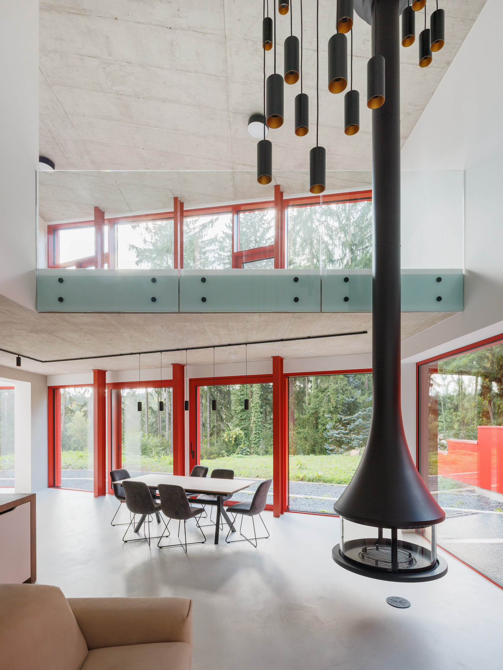 The main living space occupies the lower level and is conceived as a large, open-plan area for cooking, dining and relaxation. Double-height volumes and full-height glazing establish a strong connection with the surrounding trees, while red steel window frames articulate the façade and contrast with the changing green tones of the forest. Exposed concrete ceilings retain the imprint of formwork, reinforcing the building’s raw material character.