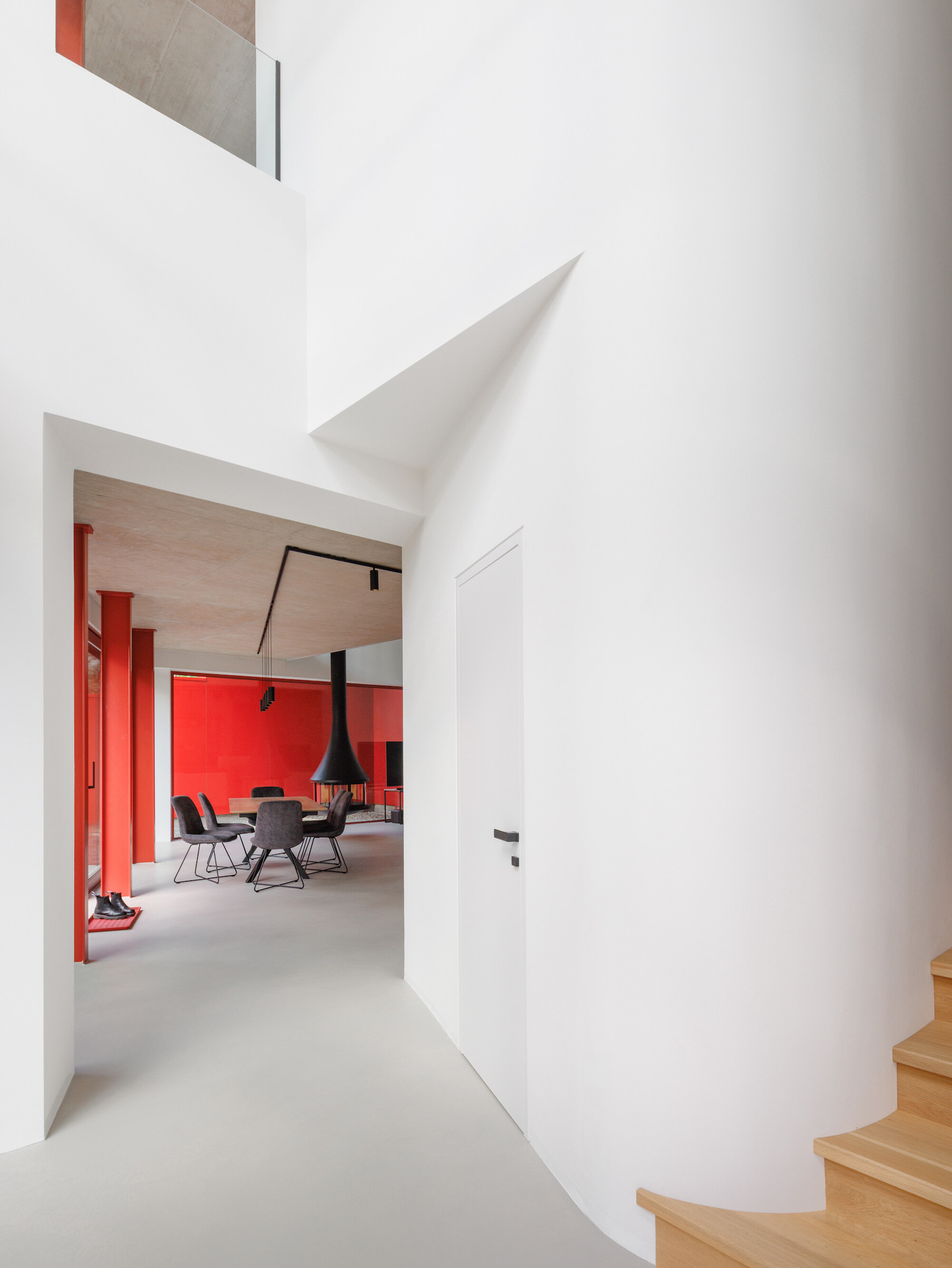 Materially, the house is defined by a restrained palette of exposed concrete, red-painted steelwork and white plastered surfaces. The kitchen introduces a more varied composition, combining stone, steel elements and timber finishes.
