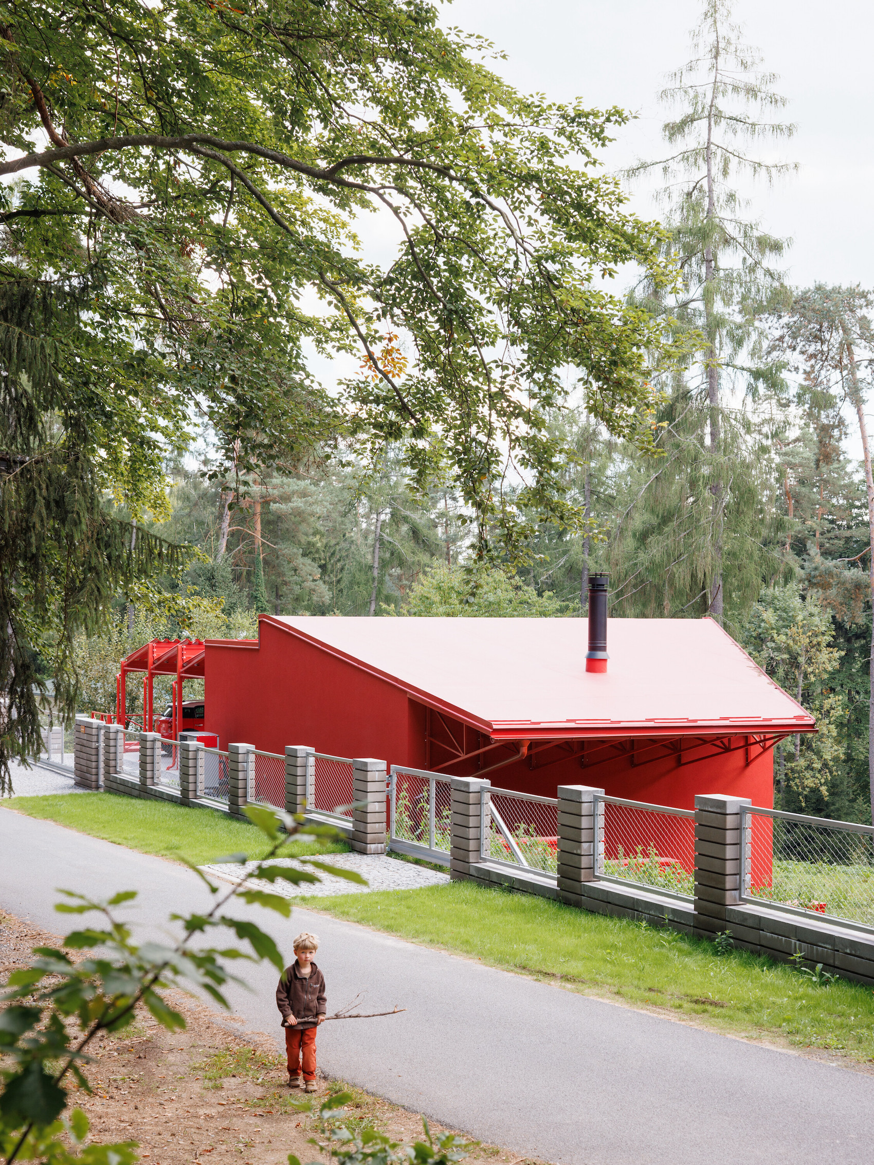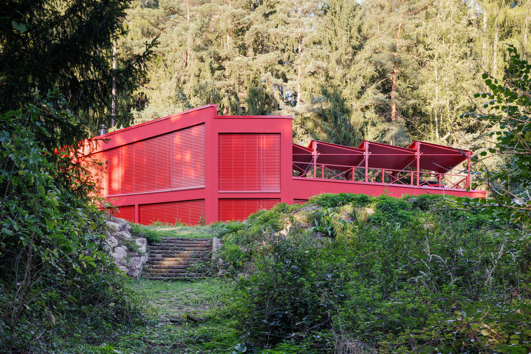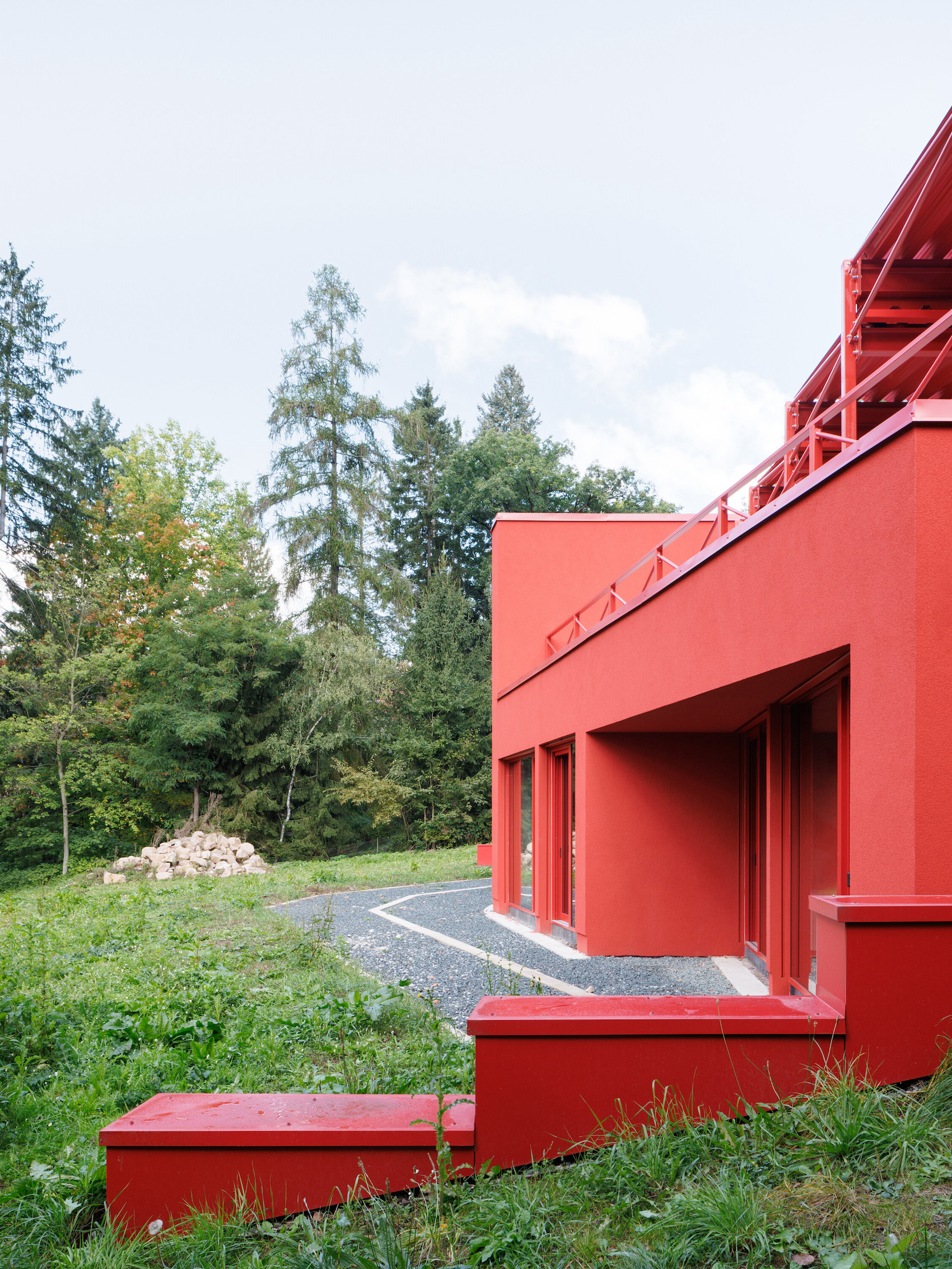 Access is from the upper level, where a roof terrace accommodates parking beneath a distinctive sawtooth canopy formed from red-painted steel. The entrance is integrated into the roofscape and leads into a central hall where views of the forest are revealed through large, irregularly-divided windows.