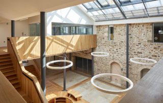 Elsewhere, previously infilled openings have been reopened and fitted with new hardwood windows and glazed screens. A number of original cast iron columns have been salvaged from the fire-torn building and incorporated in a new steel frame that supports the first floor and roof, as well as provides lateral restraint to the historic walls. Modern render and plaster coverings have been successfully removed from the stonework, with original granite flagstones carefully lifted and re-laid within the new ground-floor exhibition space. Brick gable walls at high level have also been reinstated, based on historic records.