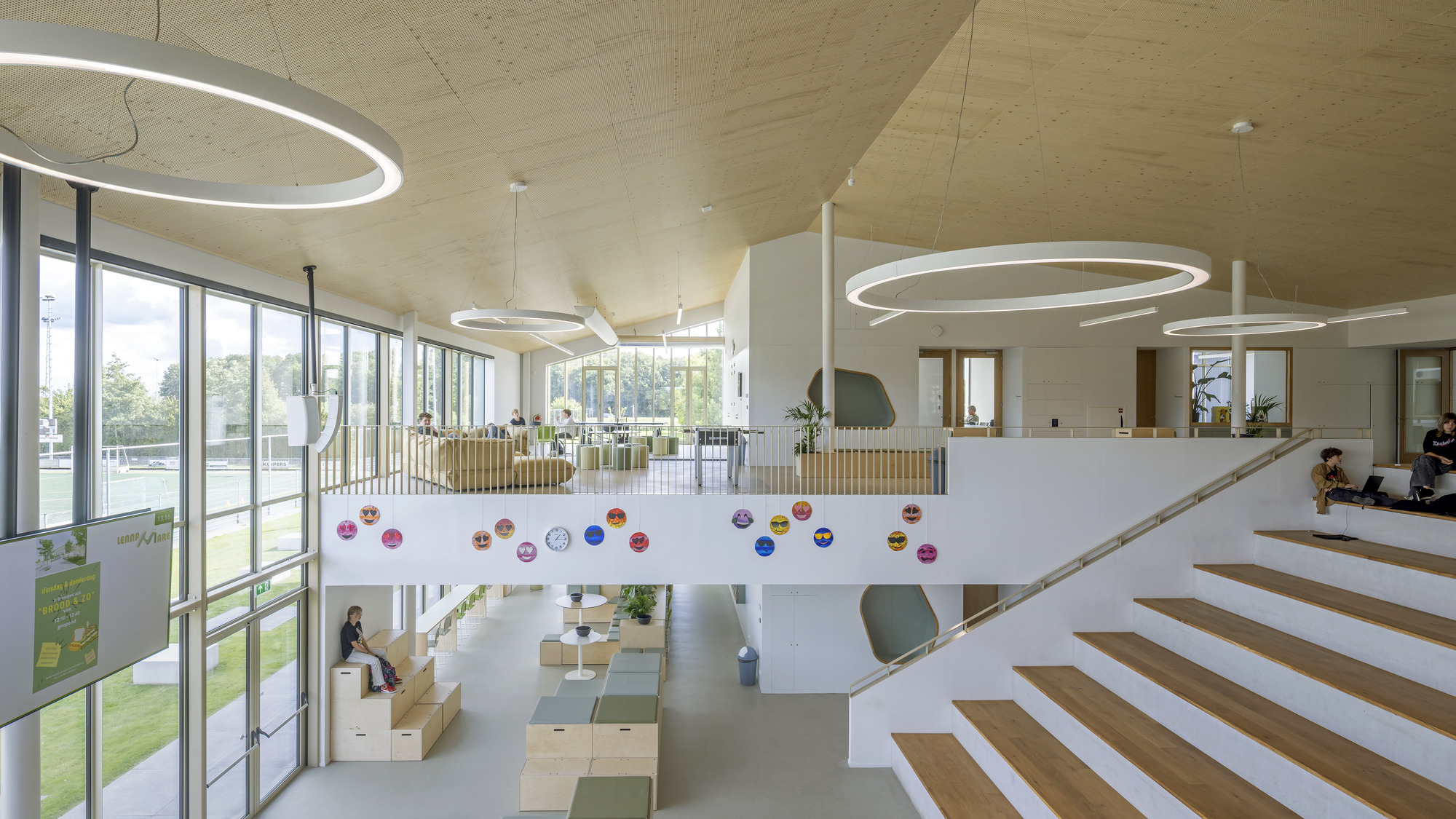 Daylight is drawn deep into the building through north-facing shed roofs, their timber structure exposed internally to lend warmth and texture. The palette of natural materials extends throughout: wood, linoleum and acoustic surfaces combine to create calm, comfortable interiors.