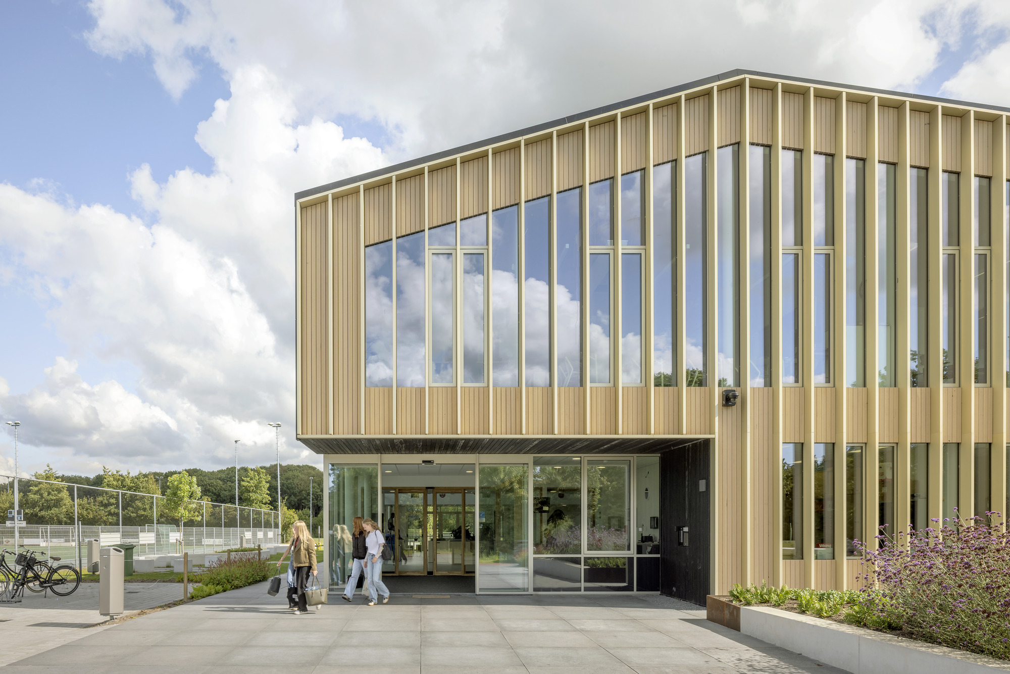 Located in Friesland, in the north of the Netherlands, the 3,100-square-metre building accommodates 355 students across VMBO (preparatory secondary vocational), HAVO (senior general secondary) and VWO (pre-university) levels. It replaces a cluster of outdated school buildings on the same site, providing a new home that is both rooted in its landscape and responsive to the school’s evolving pedagogical needs.
