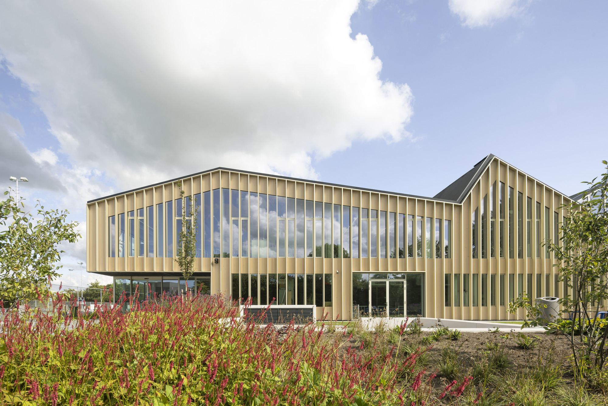 Set within the wide, open landscape of the polder, the building takes its cues from the black timber barns that punctuate the Frisian countryside. These simple, robust forms have been reinterpreted in a bio-based façade of burnt timber and preserved pine, using the Japanese Shou Sugi Ban technique to create a durable and tactile surface. The result is a sharply profiled silhouette that has is defined by a roofline composed of varying pitches onto which photovoltaic panels have been placed onto the south-facing slopes to generate renewable energy.