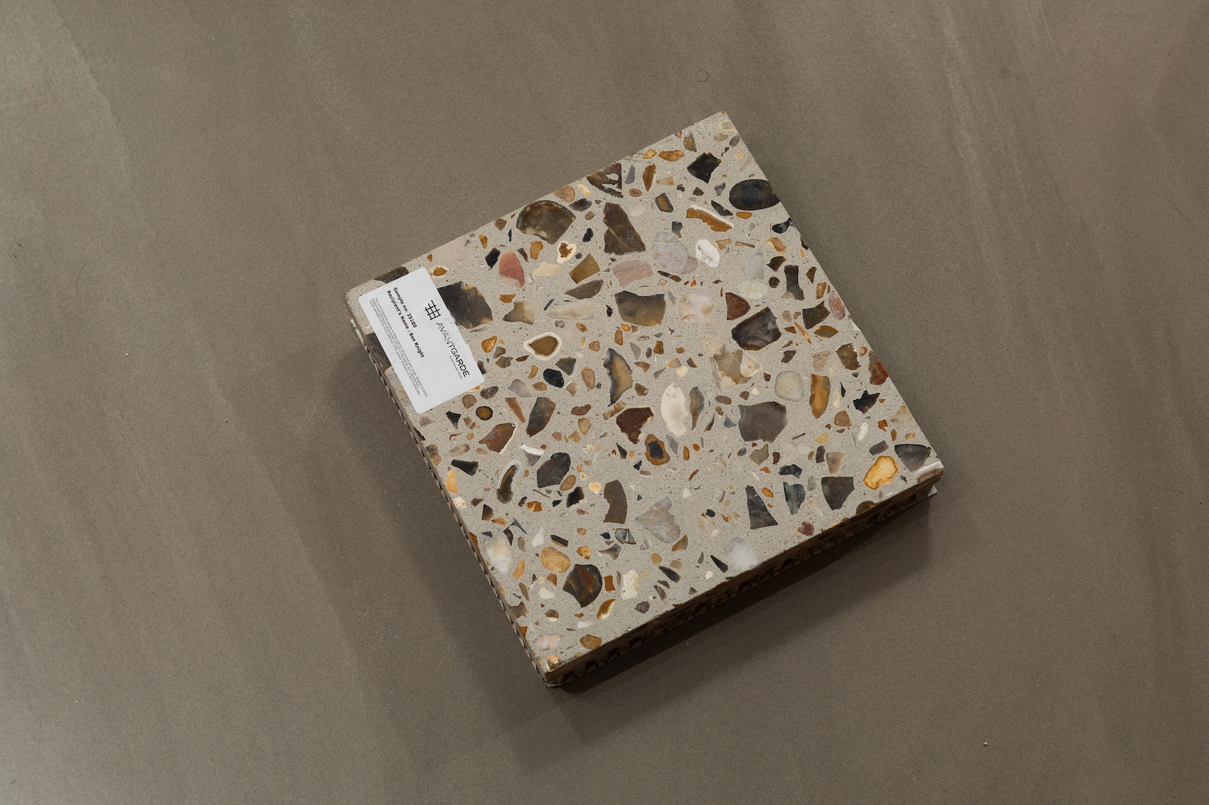 Terrazzo by Avantegarde. “Incorporating pieces of Thames flint, this highly innovative terrazzo looks like concrete. The effect is difficult to achieve (due to the polished un-keyed nature of the flint) so Avantegarde uses recycled aluminium cans to bind the material together.