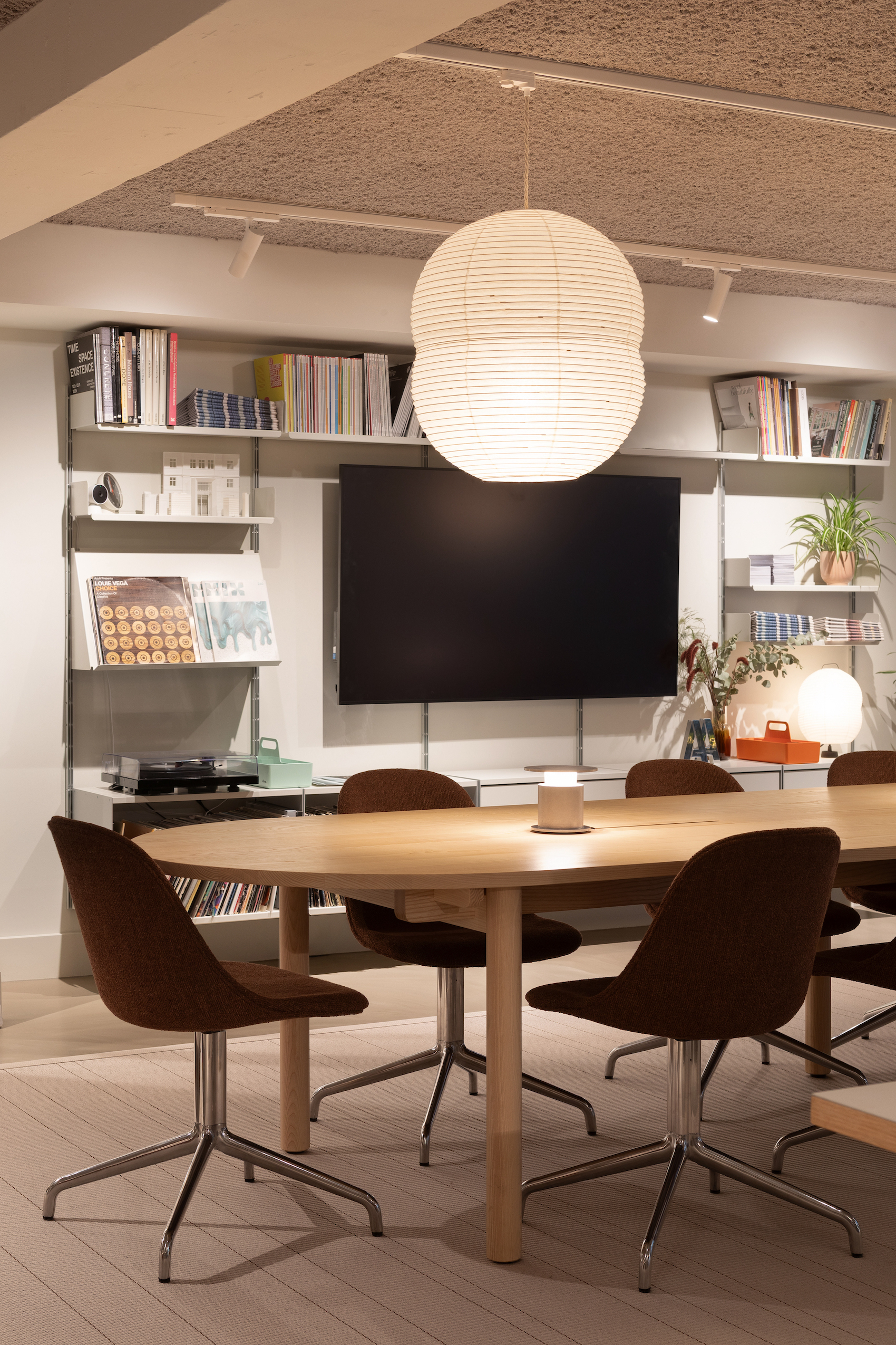 Julian de Metz Absolutely. We ask suppliers to bring us materials with a story; something innovative, sustainable, or simply unusual. We want this to be a place where those conversations happen. At the same time, it had to look good. A big sample library can easily end up looking like a jumble sale, if it’s not properly curated. Added to this, the furniture is designed to be demountable, so we can clear the space in ten minutes for a 100-person event. The Eiermann tables lift off, the cables unplug with just two leads, and everything stacks away neatly. It’s all about flexibility.