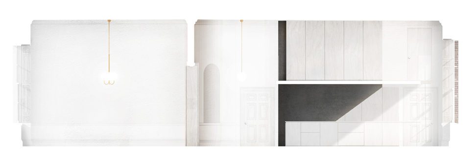 An island of Arabescato marble is centrally located within the kitchen, where a reduced domestic scale beneath the mezzanine contrasts with the grand floor-to-ceiling heights of the hallway and front drawing room. A series of sculptural boxes provide storage for services and appliances. Set apart from the walls and above the skirting, the boxes allow for architectural details to remain uninterrupted and pass through the cabinets without being adapted or altered. Careful attention was paid to the distances and junctions between the historic and contemporary layers to ensure old and new quietly co-exist and complement each other both visually and programmatically. Restoration of the original marble surrounds was undertaken to remove the stains that had resulted through decades of smoke damage and neglect, and the timber surround was repaired and cleaned to reveal the simple ornate moulding.