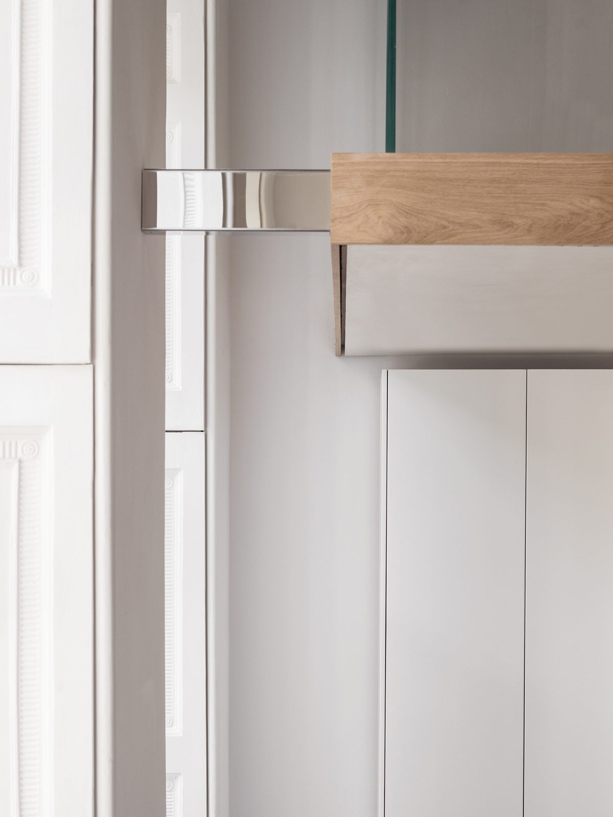 Insensitive additions have been removed, revealing the original proportions of the prime ‘piano nobile’ floor. “It was important that the programme of inhabitation did not dominate the architectural space”, says the architect. This is achieved by limiting the new interventions to freestanding joinery, panelling, and sliding and folding planes, which, along with the alterations, read as new layers within the historic interior.