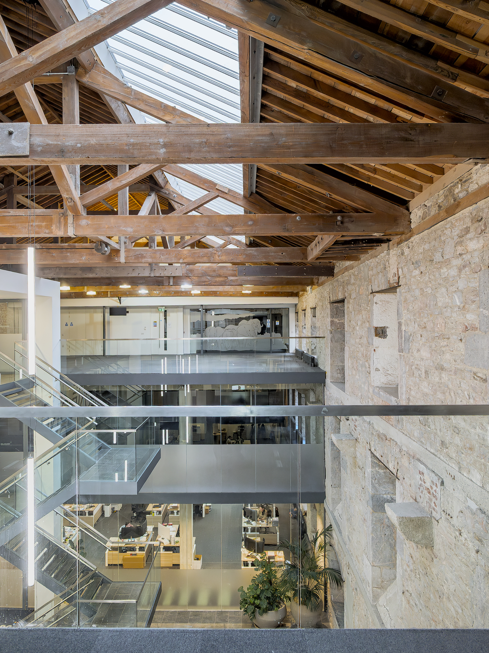 Right: Lightweight steel floors and stairs, together with glass balustrades, articulate the office atrium and contrast with the surrounding masonry and timber structure.