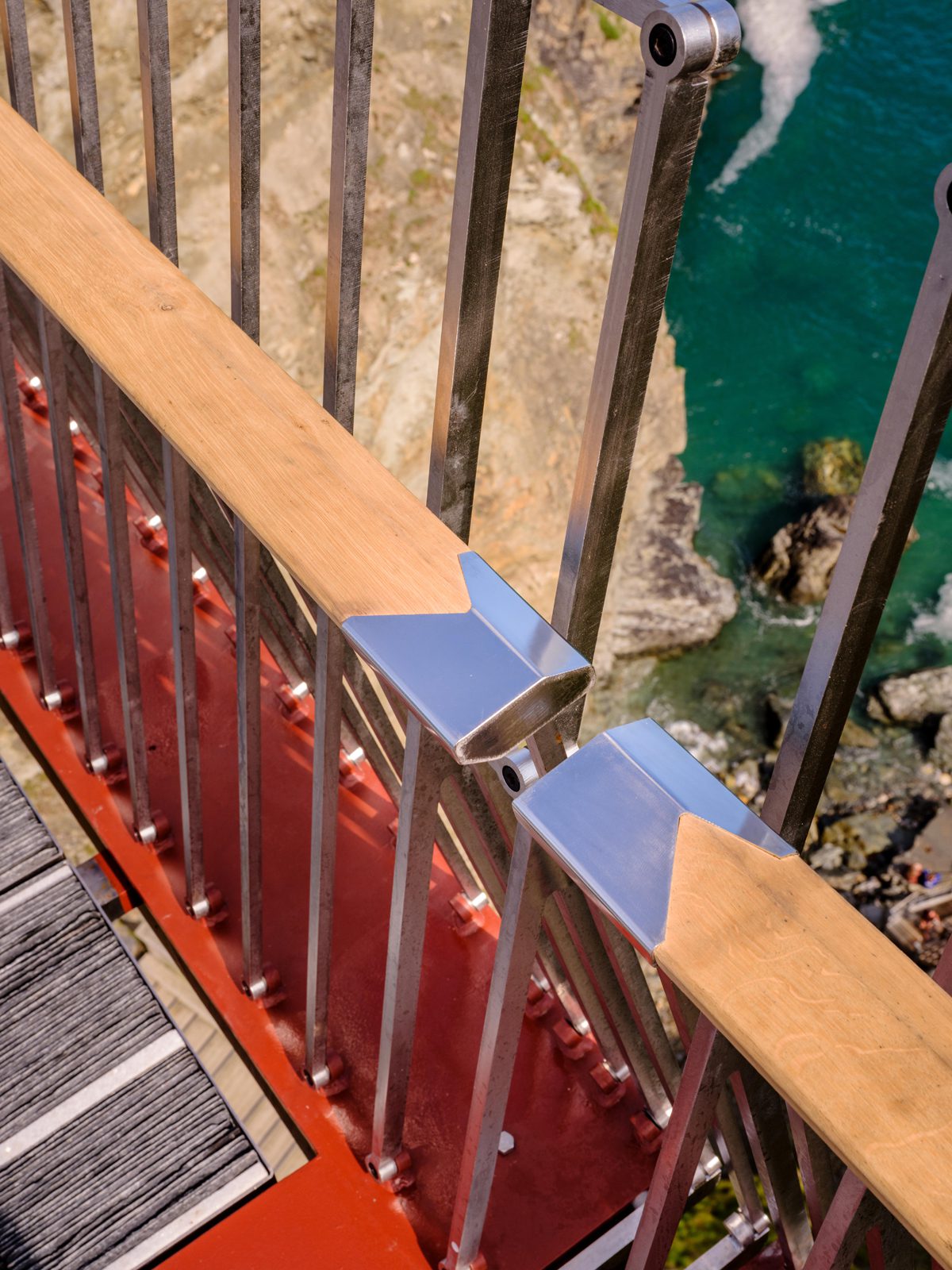 The surface of the bridge deck is formed of 40,000 hand-cut Delabole slate tiles, from a quarry three miles from Tintagel. They are laid on edge in steel trays and interspersed with white quartzite tiles – an allusion to the lines of quartz found in local slate. The bridge is secured to reinforced concrete abutment blocks by 15-metre-long Dywidag rock anchors. The Telford bracing is in electropolished stainless Duplex steel. “Contrasting weathered and non-weathered steel allows sunlight to play on the structure but also gives it an ephemeral quality, allowing the bridge to harmonise with the coastal landscape”, says WMA. The 40mm gap between the two halves of the bridge is matched by a gap in the English green oak handrail. “Visually the link highlights the void through the absence of material in the middle of the crossing”, says WMA.