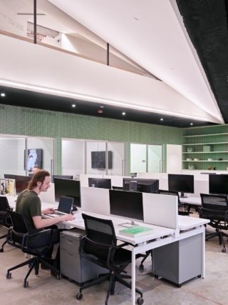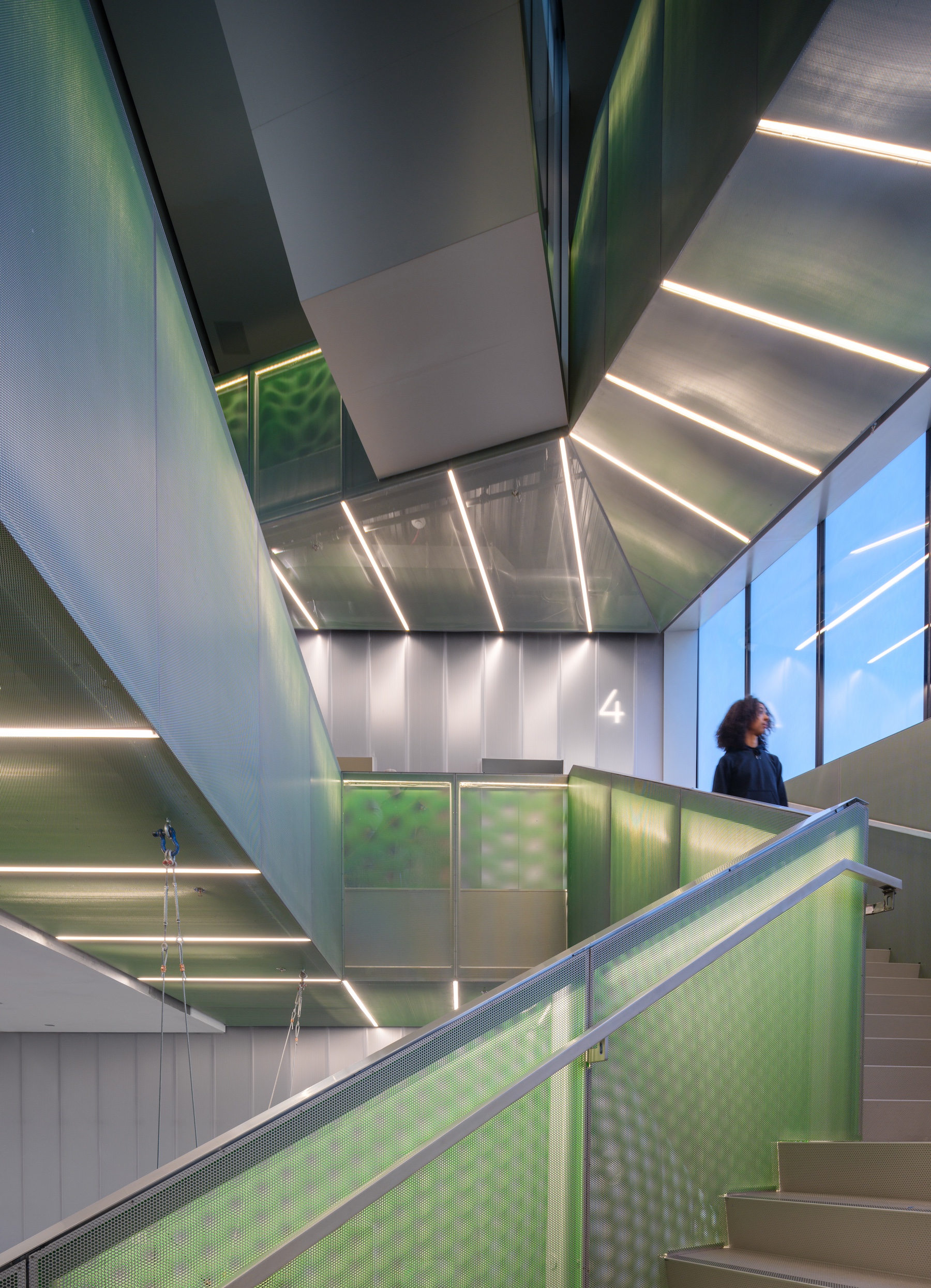 ARUP provided structural engineering and MEP design across the integrated building, supporting clarity in the circulation strategy through a complex truss structure and a geometrically intricate central stair. Crucially, the staircase was maintained as a continuous architectural element through an innovative fire-protection approach. By incorporating concealed voids above the perforated ceiling to accommodate smoke and heat accumulation, the design allows the stair to occupy and define the full height of the atrium at the building’s core.