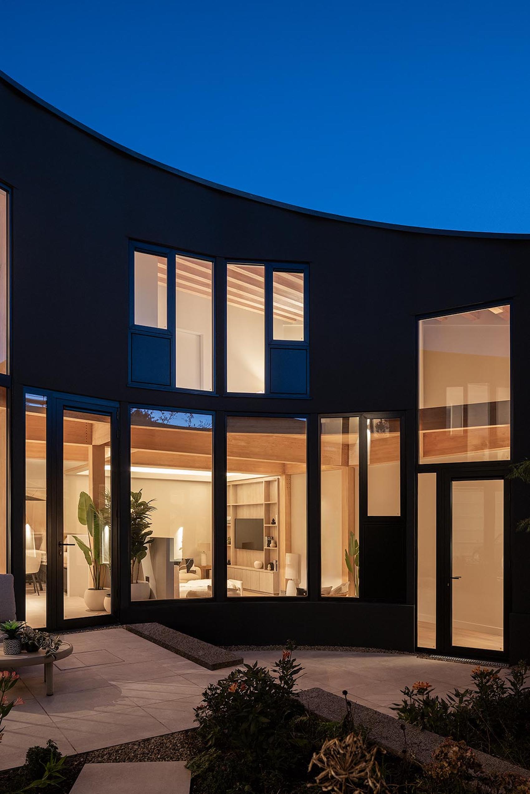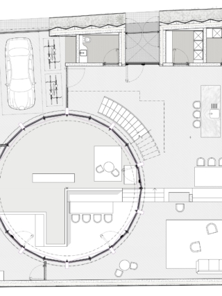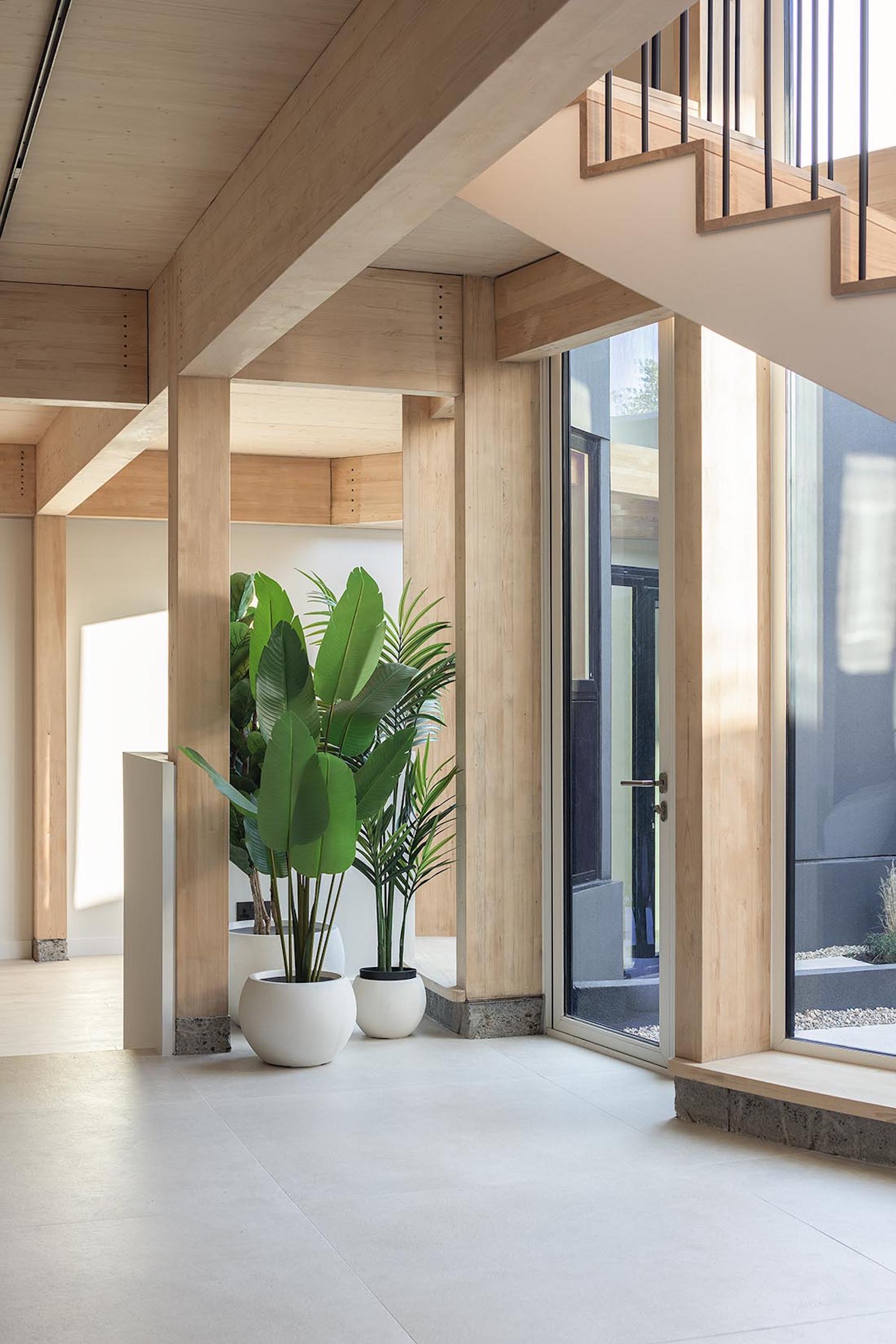 A pre-fabricated CLT structure is set into concrete foundations, with timber roof and floor panels added on site. The circular courtyard is defined by 20 glulam columns, which support the upper level while framing continuous floor-to-ceiling glazing allowing natural light and ventilation to filter into all rooms in the house.