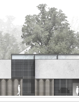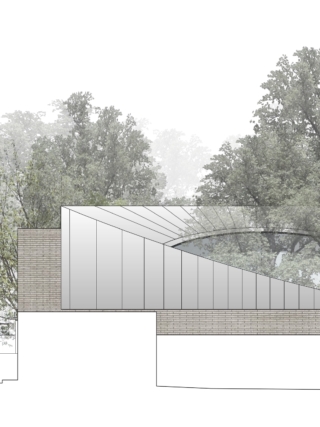 A concertina façade of slim white bricks and corten steel wraps around the eastern elevation where the sloped roof is at its highest. Ceiling height drops down to single storey in the south-western corner. The roof and triangular gables are finished in a zinc cladding with vertical standing seams, mimicking the timber structure beneath.