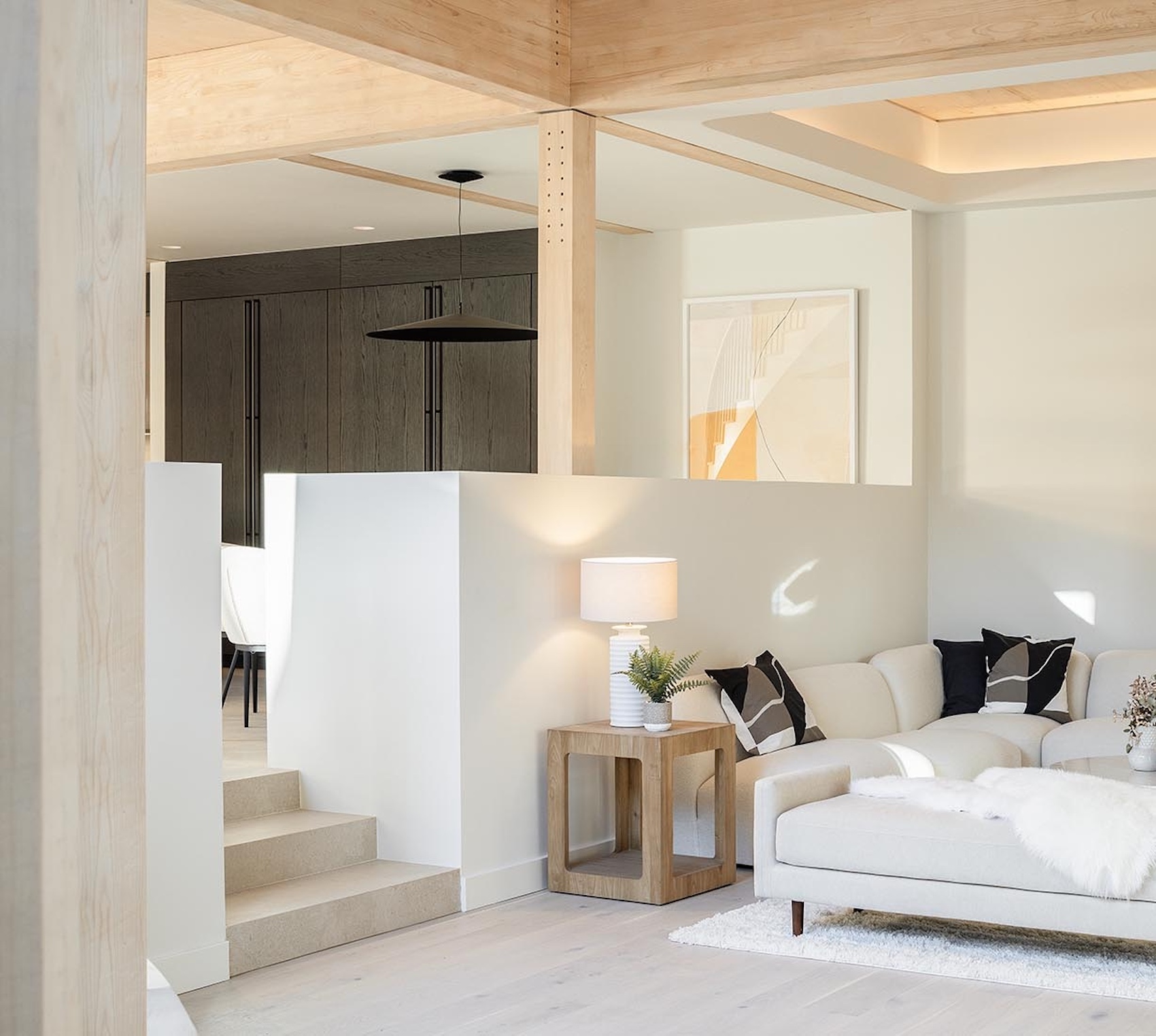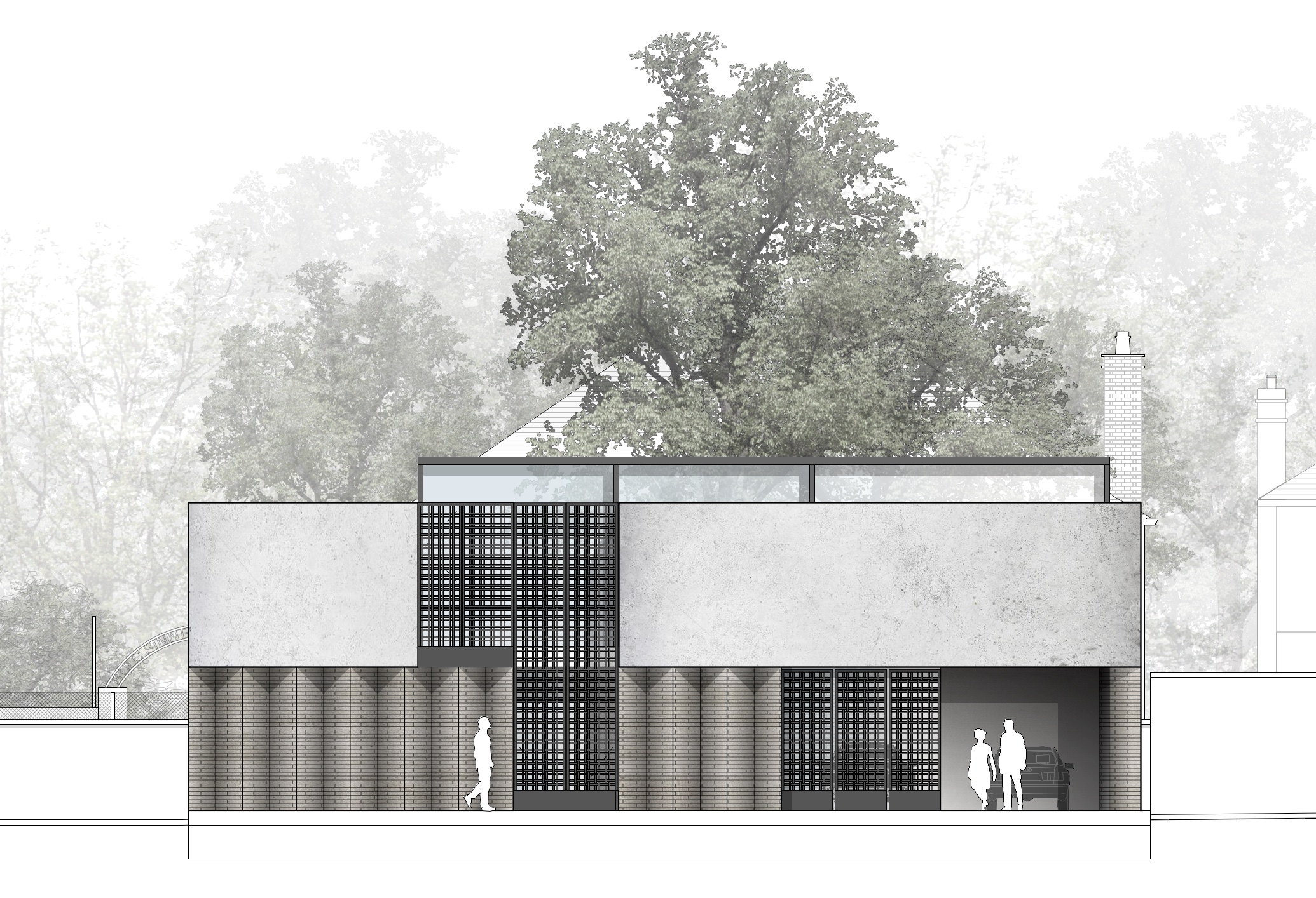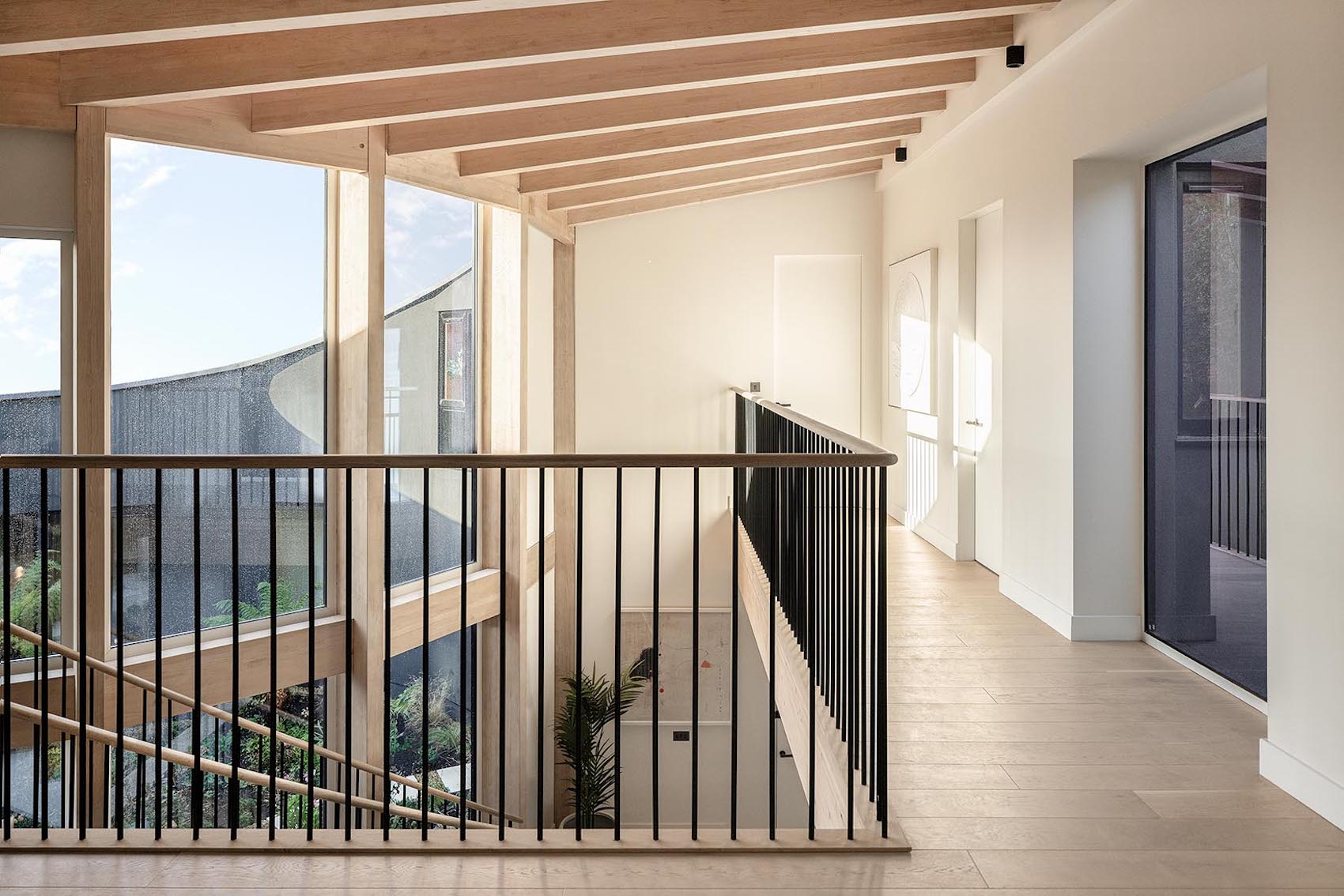A concertina façade of slim white bricks and corten steel wraps around the eastern elevation where the sloped roof is at its highest. Ceiling height drops down to single storey in the south-western corner. The roof and triangular gables are finished in a zinc cladding with vertical standing seams, mimicking the timber structure beneath.
