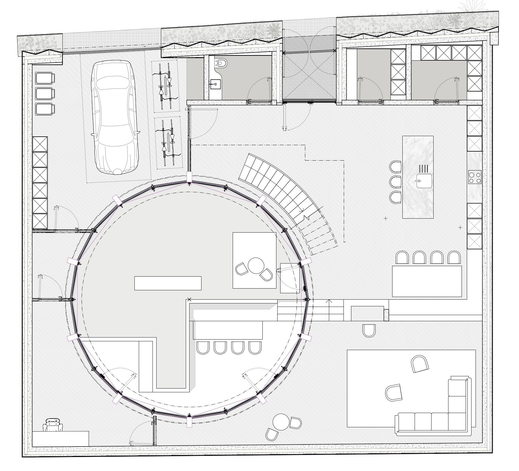 A pre-fabricated CLT structure is set into concrete foundations, with timber roof and floor panels added on site. The circular courtyard is defined by 20 glulam columns, which support the upper level while framing continuous floor-to-ceiling glazing allowing natural light and ventilation to filter into all rooms in the house.