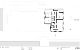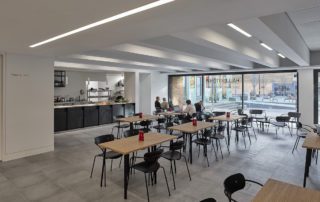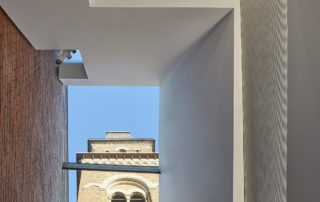 The main entrance opens onto a triple-height atrium featuring raked brickwork and a contrasting white stair that rises towards a glass roof that admits views of St Peters. Blackened steel is used to form a ‘shroud’ at the entrance to the existing building, as well as a reception desk and sliding door into the cafe.
