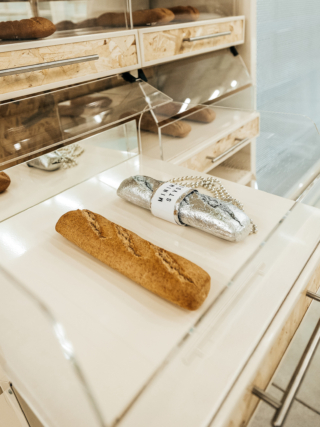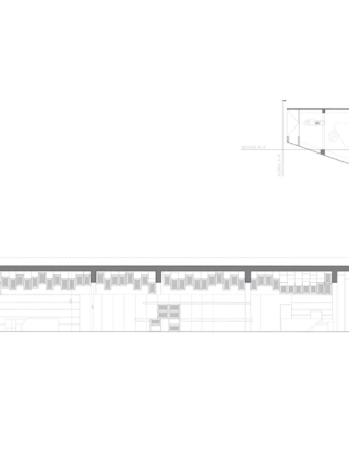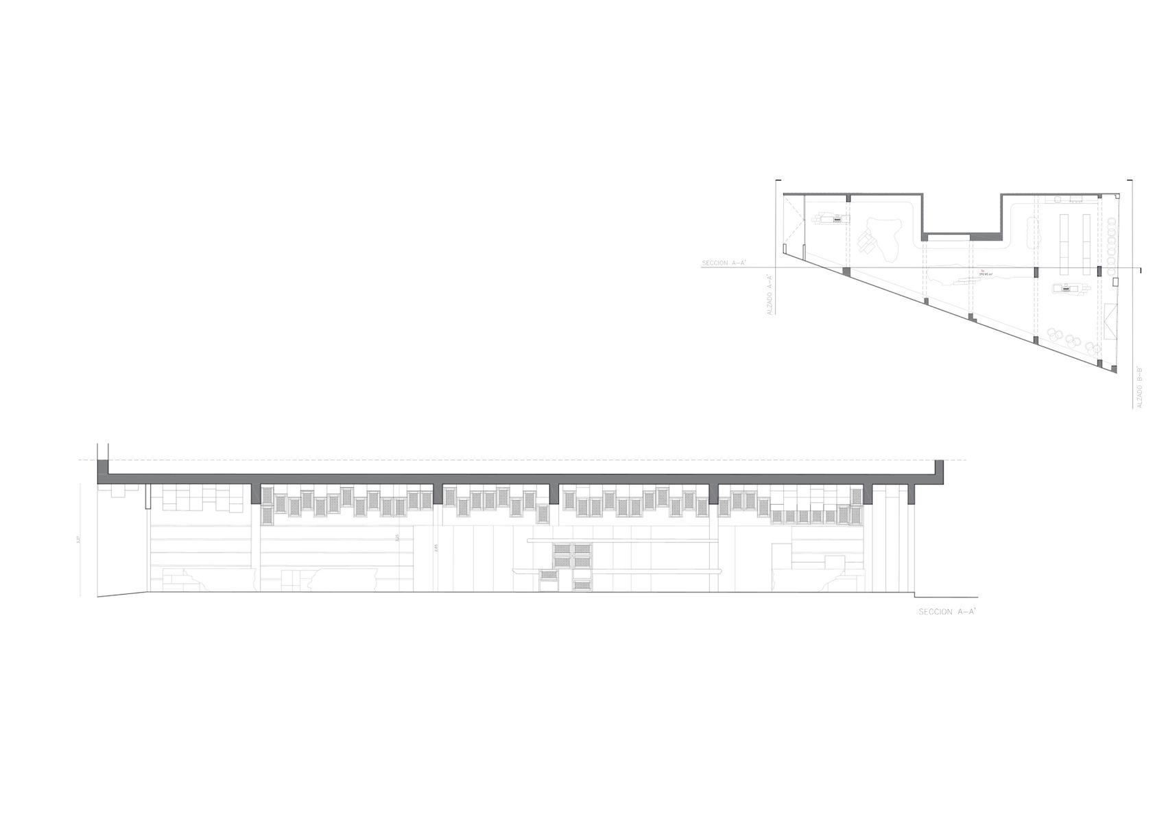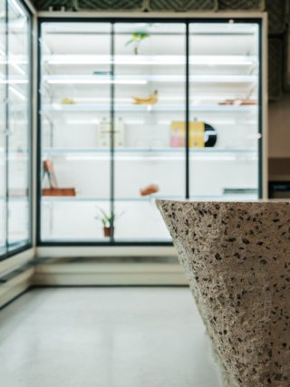 The interior language continues the project’s brutalist logic. Polished concrete is used for the floor, checkout counters and display tables, while steel shelving units provide a utilitarian framework for goods. Walls are finished in mortar, and lighting is kept indirect, allowing the merchandise to be highlighted by the interplay of shadow and surface.
