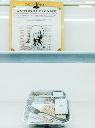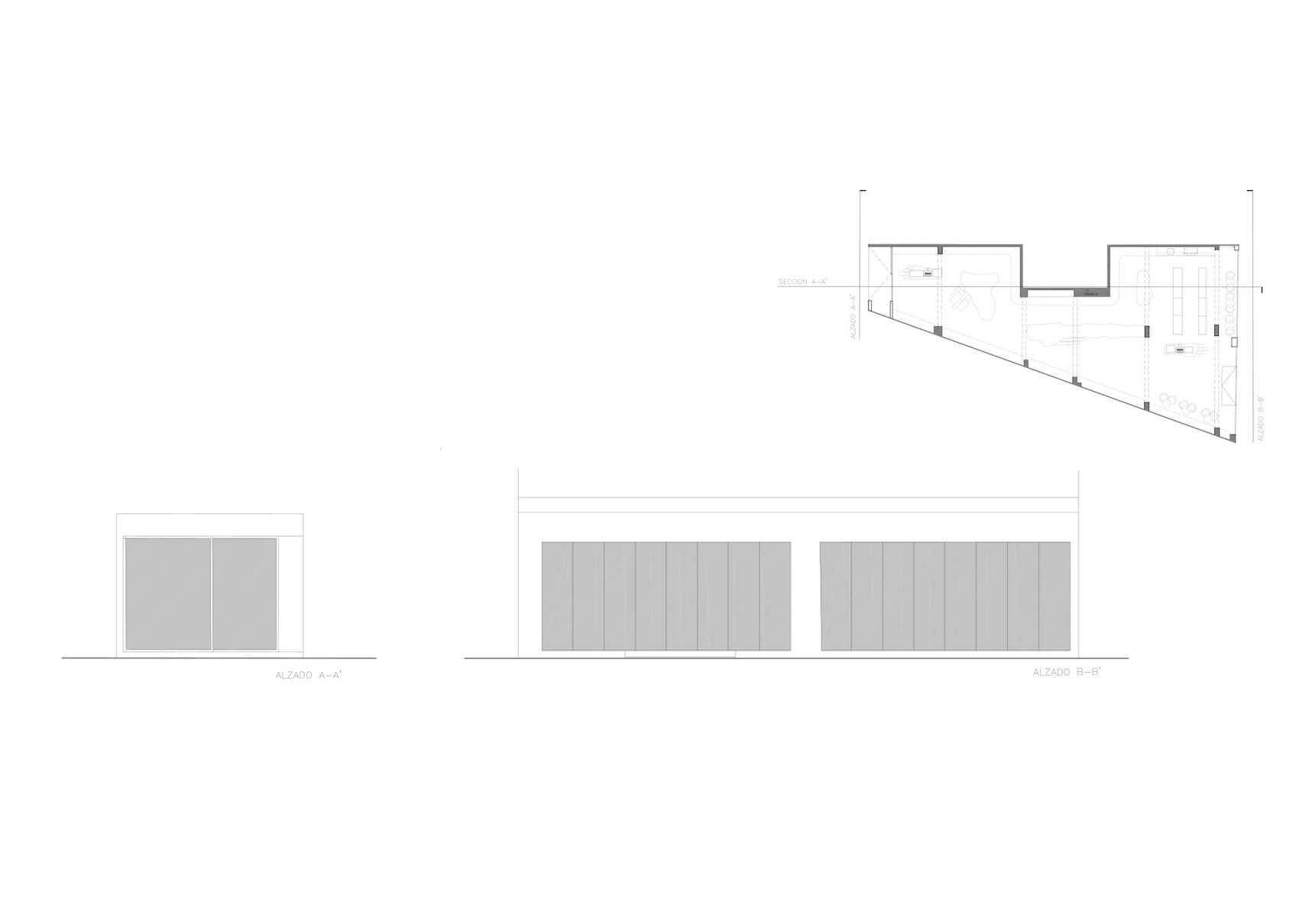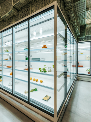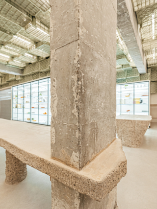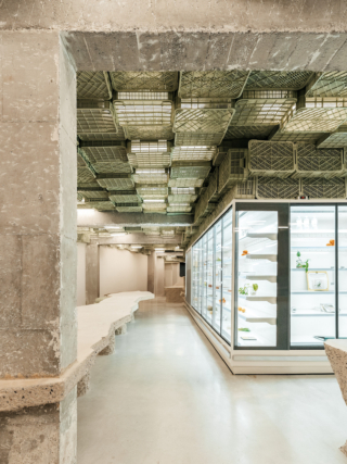 The structure presents as a raw concrete volume with unadorned façades. Recessed entrances, conceived as dark portals, heighten the contrast between the exterior and interior. Inside, a monolithic composition of concrete, steel and repurposed plastic creates a stripped-back atmosphere that is intended to foreground both the architecture and the act of consumption.