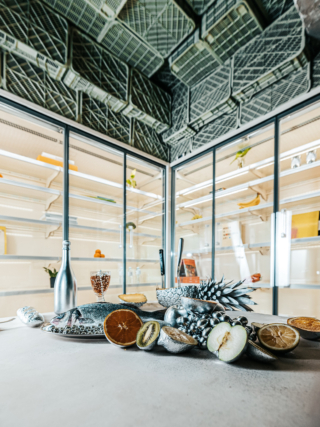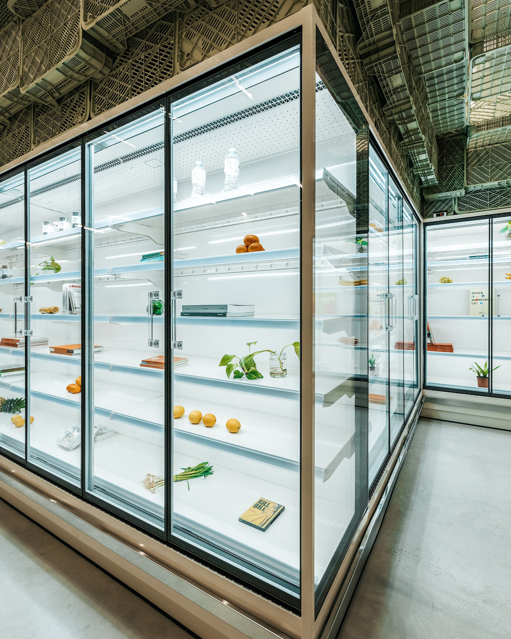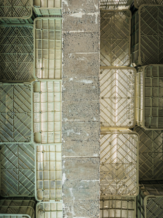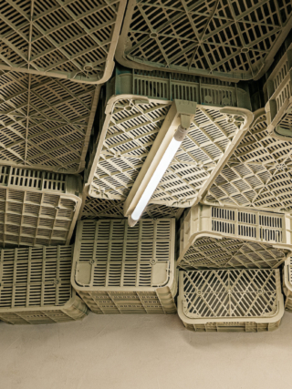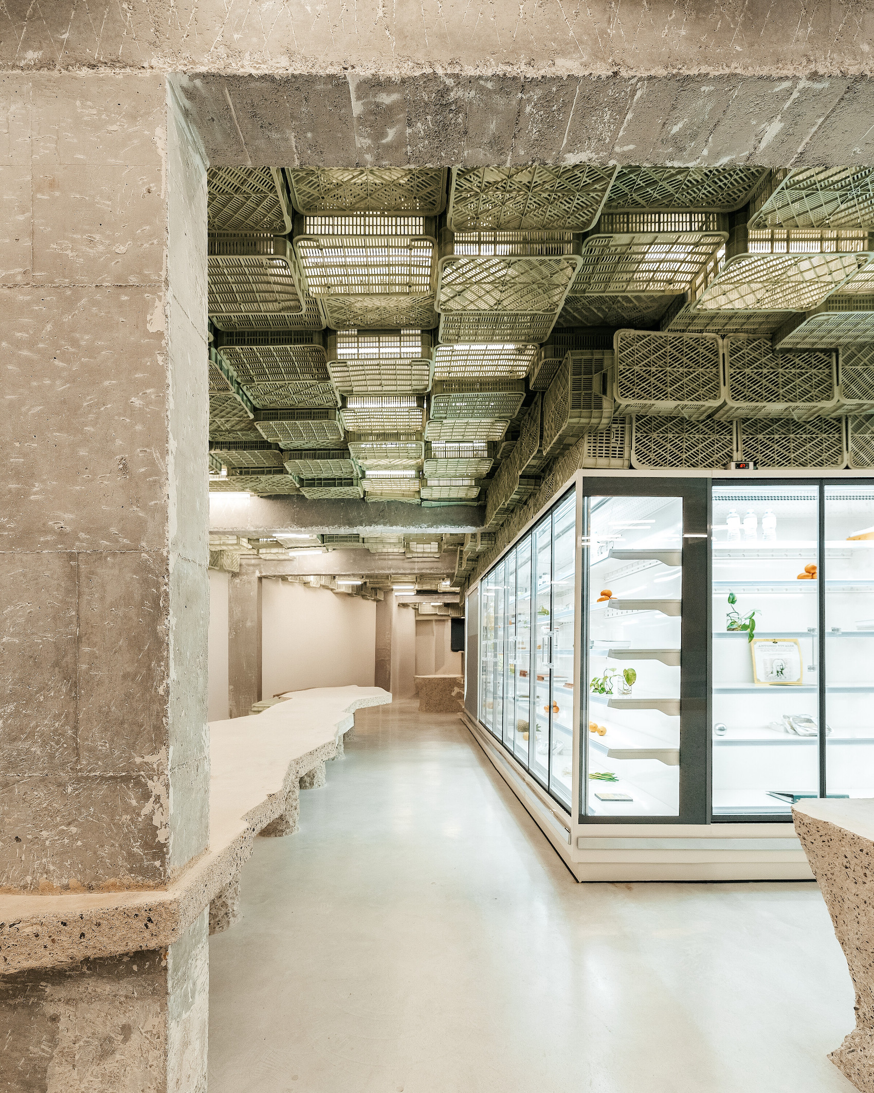 The centrepiece of the design is a suspended modular ceiling comprising more than 1,000 recycled plastic crates. Each crate serves multiple functions: diffusing natural light, concealing lighting and mechanical systems, and incorporating elements of rainwater management. The crates – typically used in logistics – are recontextualised here as both structure and ornament, forming a continuous overhead grid that casts dynamic shadows across the space throughout the day.