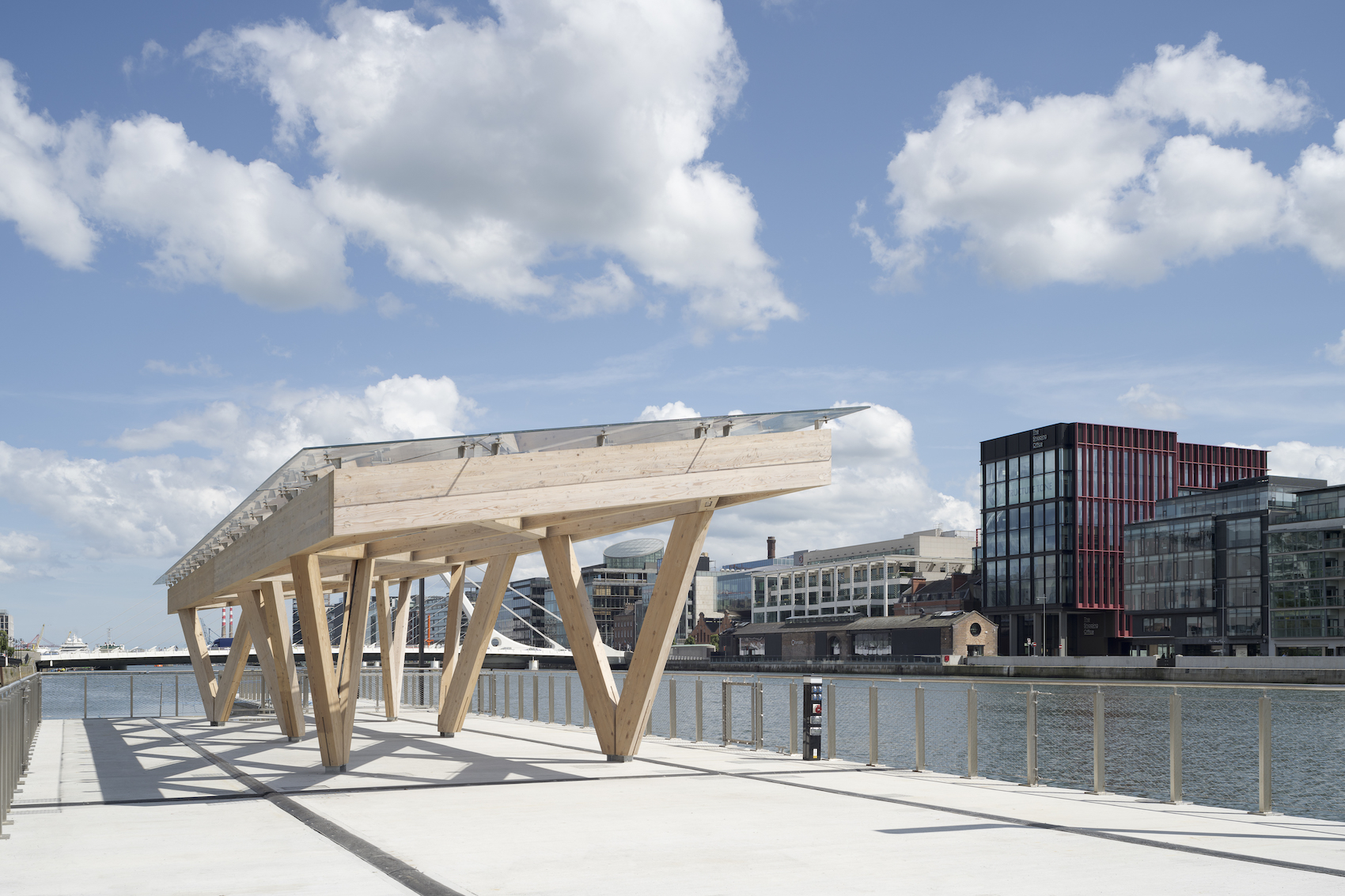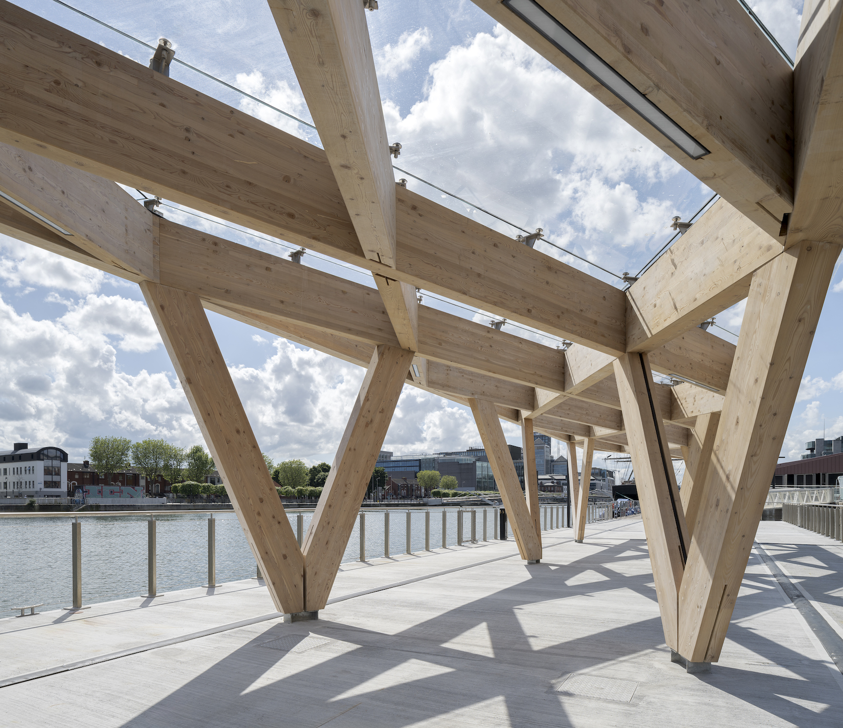 The site sits adjacent to the former Queen’s bonded timber yard, and timber is used both structurally and aesthetically throughout the project. A timber structure is left exposed internally, while geometric, glulam canopies sit down on the pontoon.