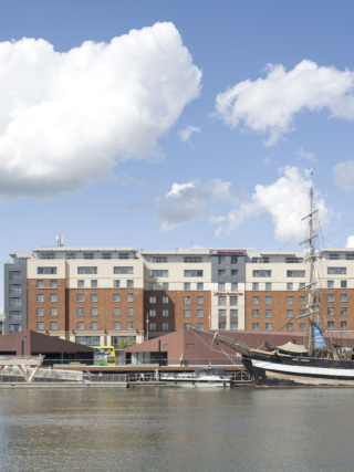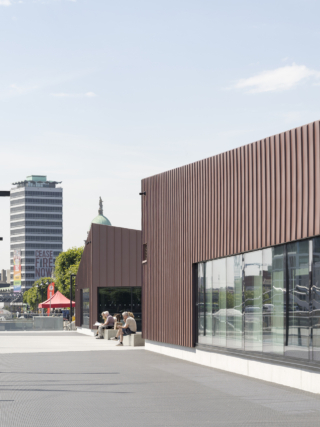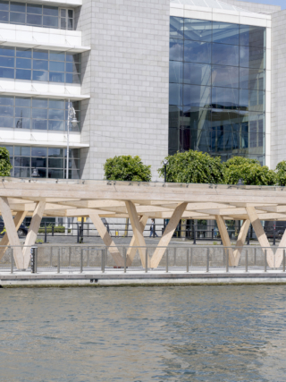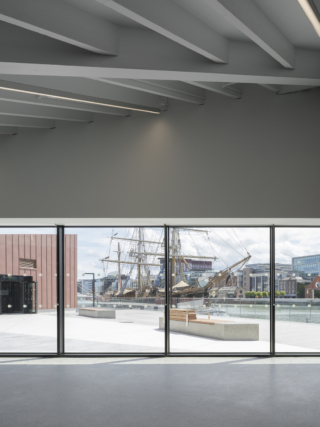 The site sits adjacent to the former Queen’s bonded timber yard, and timber is used both structurally and aesthetically throughout the project. A timber structure is left exposed internally, while geometric, glulam canopies sit down on the pontoon.