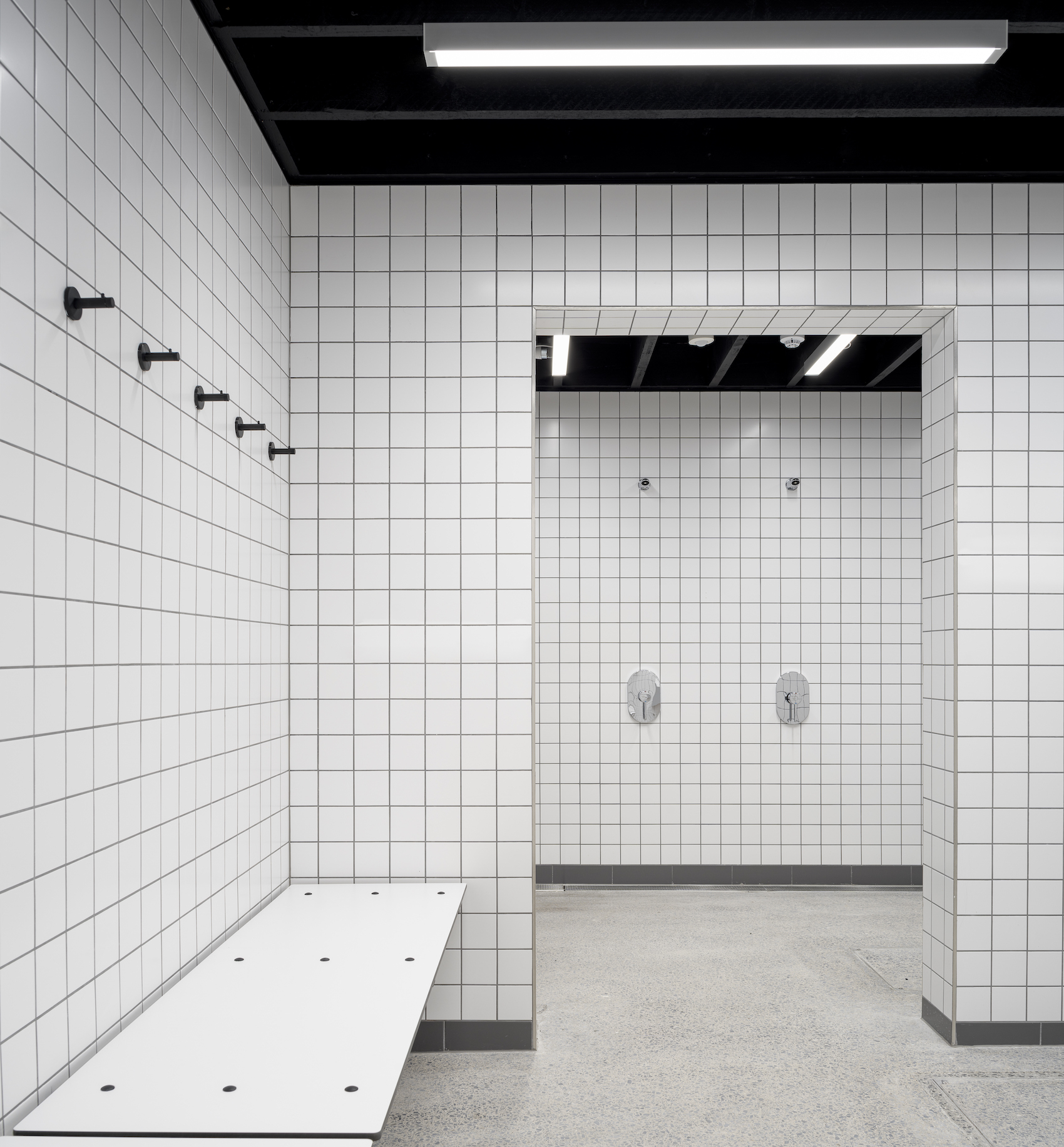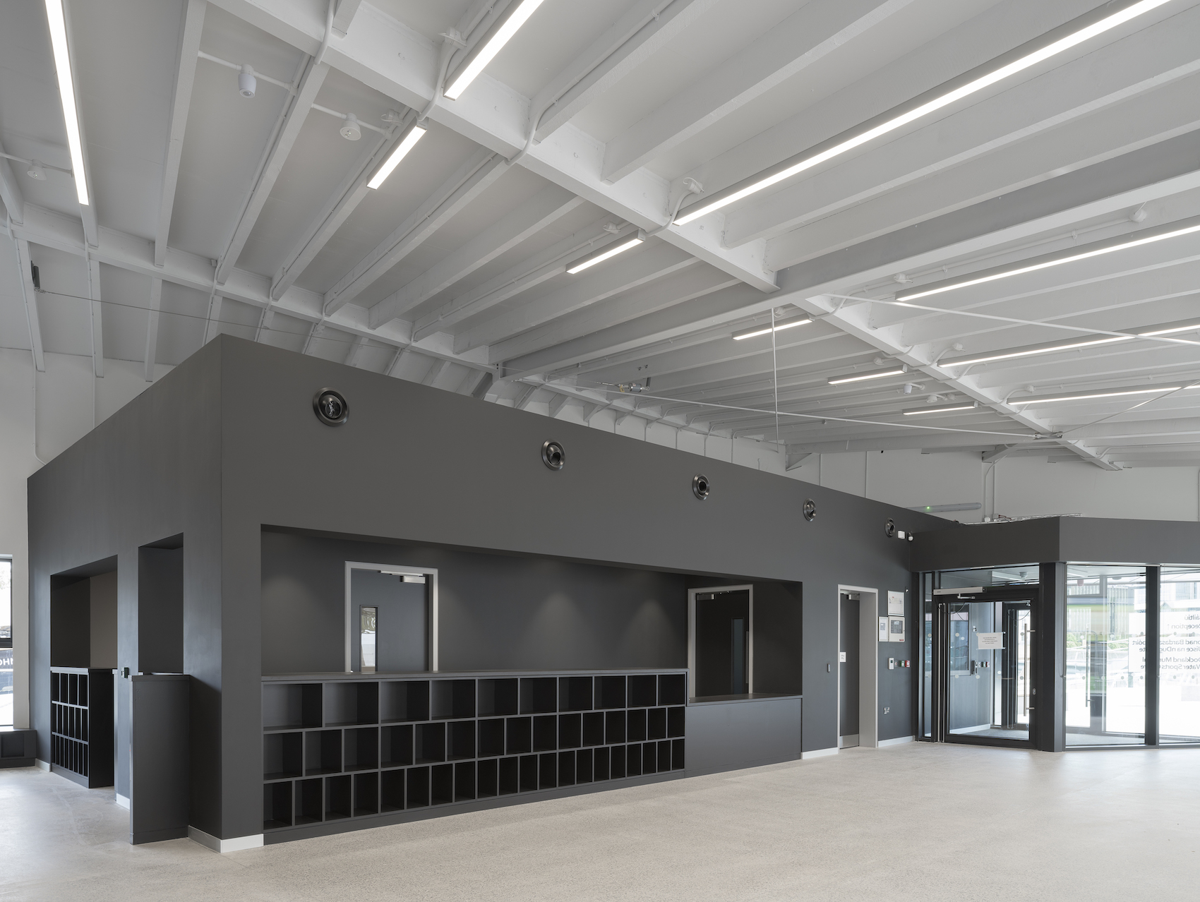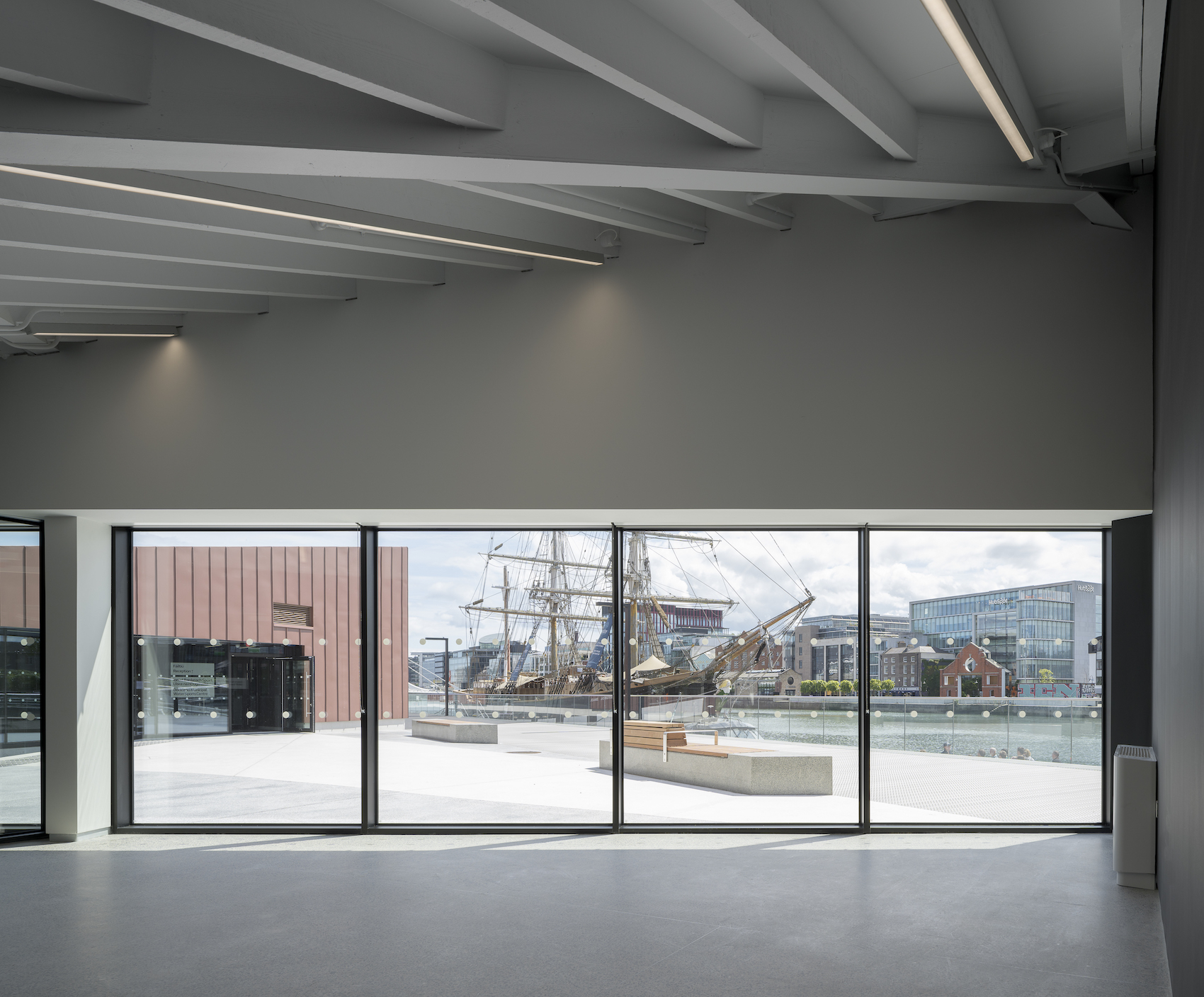 The western building is to house a new Docklands base for Dublin City Council, with a large, river facing boardroom, offices and basic amenities. The eastern building is to be occupied by the cities first public watersports centre. Largely open plan, offices, equipment hire, changing rooms and amenities float as units in the space, painted a dark grey against the bright white of the timber beams, making a relatively small space feel open and airy. Viewed from the south across the river, or from the north across the street, the building simultaneously evokes two diametrically opposed architectural typologies: robust brick warehouse, and lightweight tent.