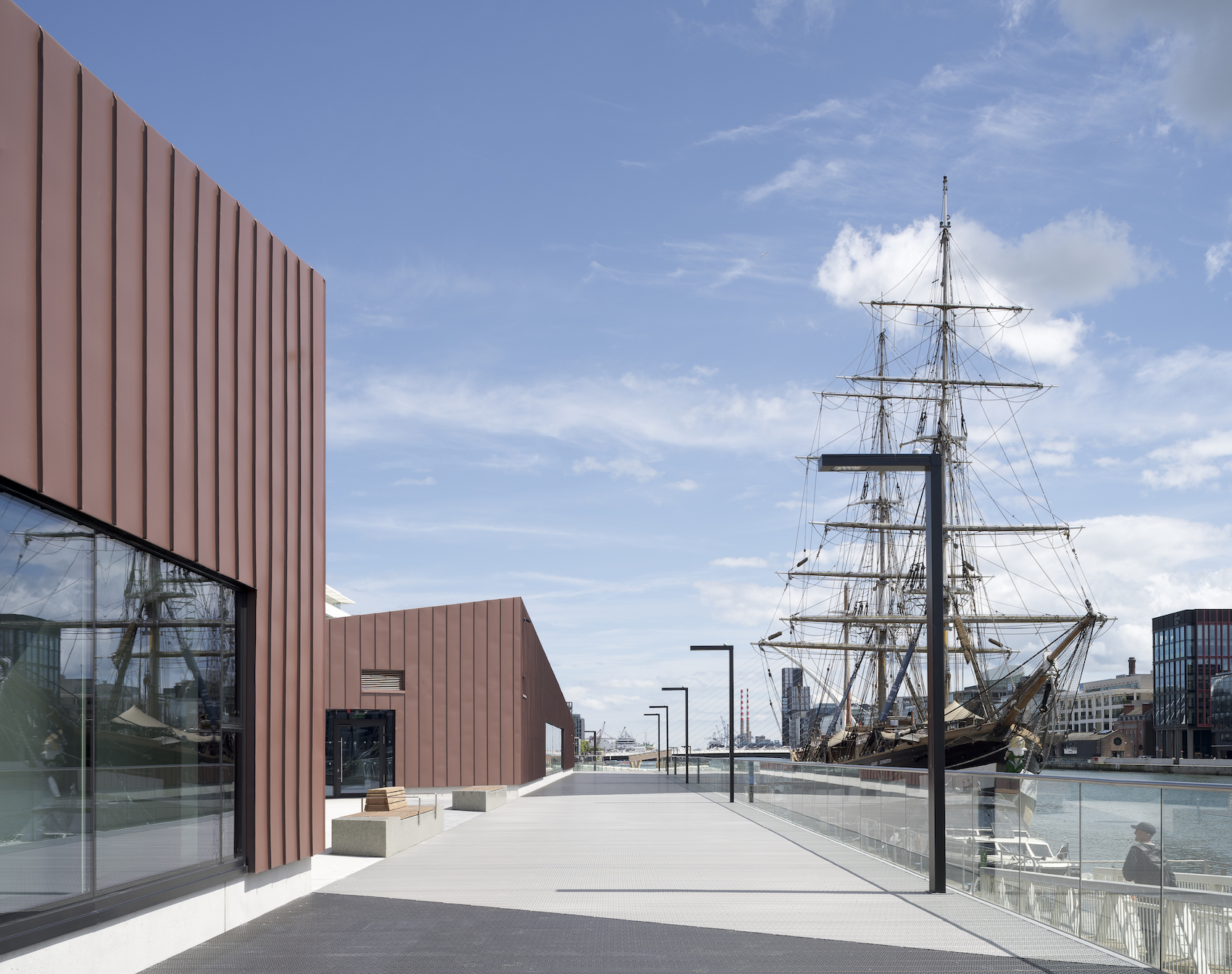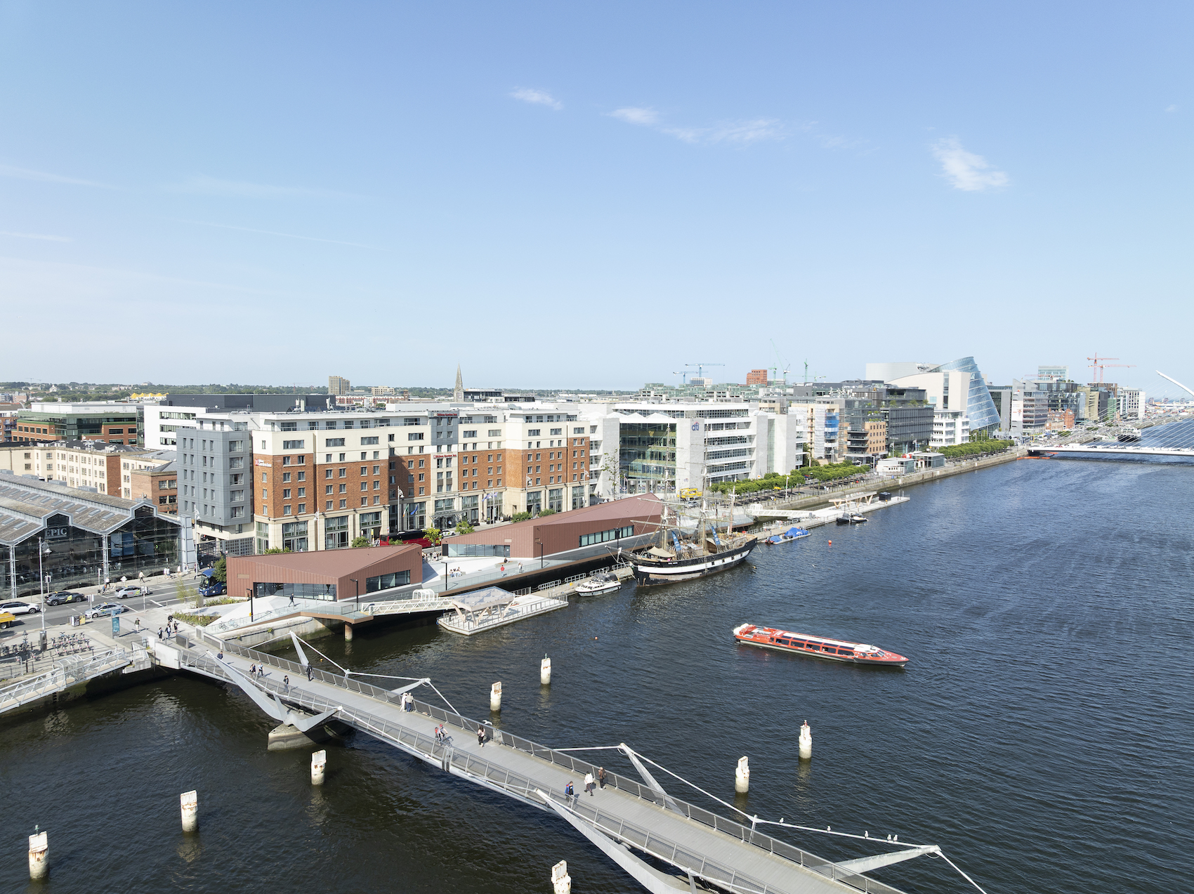 A warehouse-inspired structure is sliced in two by a new public space and accessible boardwalk, enabling step-free access to the river and establishing a clear visual connection between the emerging maritime quarter and the water. The Liffey is established as an active civic stage, as kayaking, rowing and sailing are brought into everyday view.