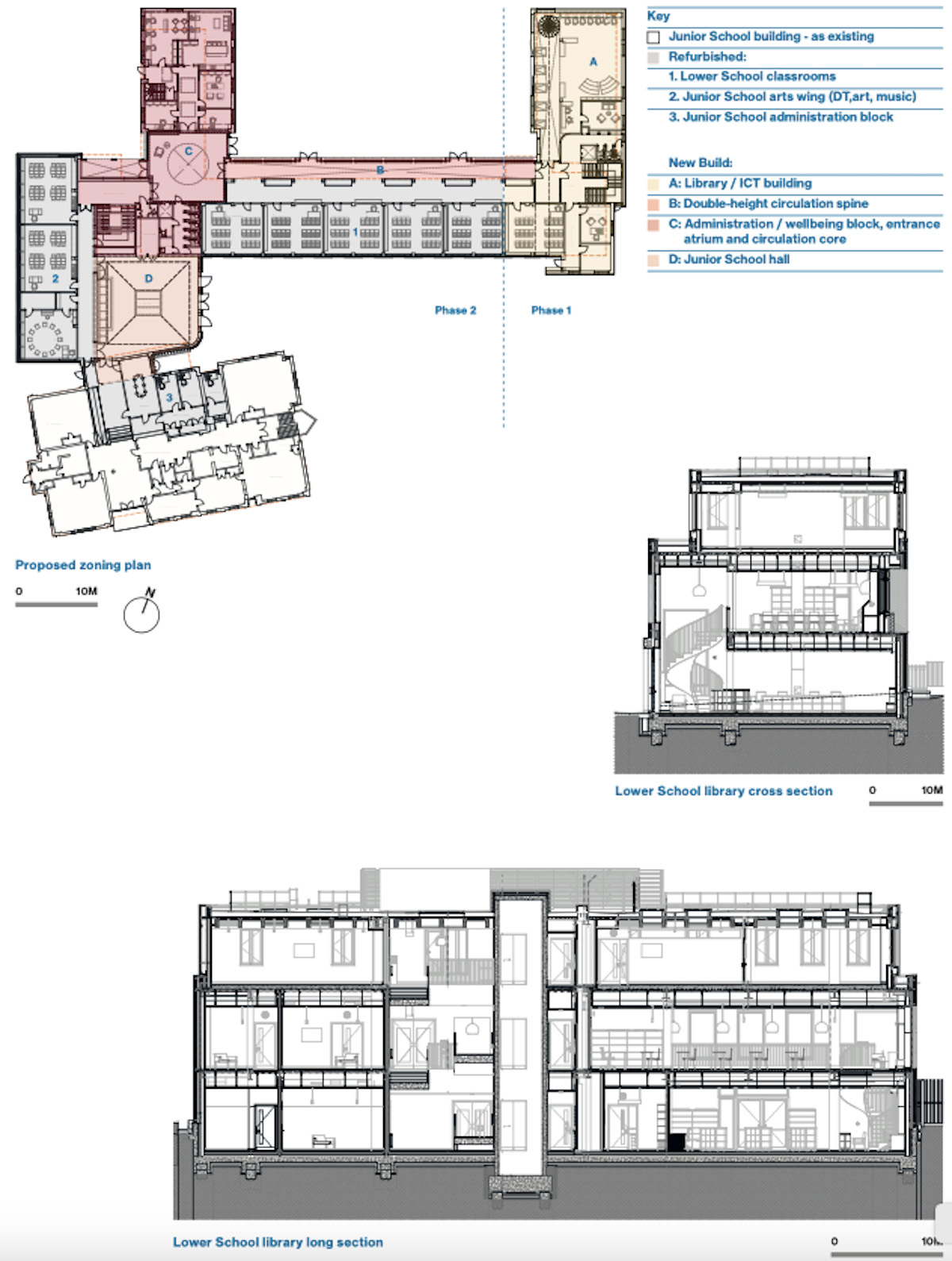 Meeting this brief will involve four interventions in two phases. Phase 1, the Raymond Chandler Library, replaces a fatigued row of single-storey portacabins and two new classrooms. The second phase will upgrade the Austin Vernon & Partners building, creating a new arts wing for the Junior and Lower Schools for music, art, and design and technology, and a distinct assembly hall for the Junior School.