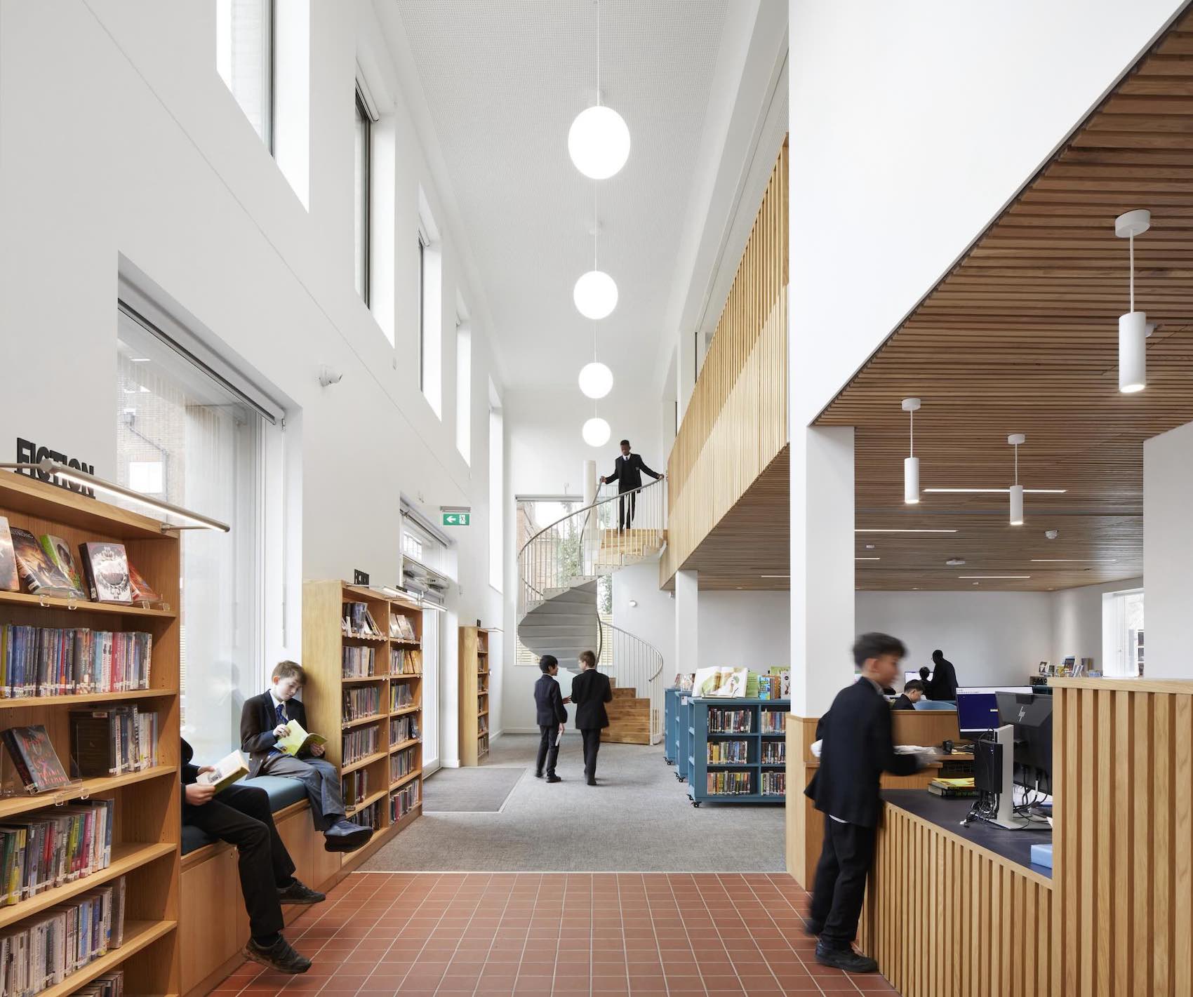 The three-storey building replaces a single-level portacabin in use since 1998 with two open and airy library floors united by a double-height atrium. A third level, set back from the main frontage and clad in scalloped precast panels, provides ICT learning spaces and a robotics suite.