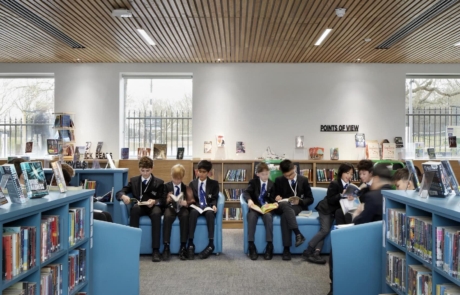 The stars of the show here are the ziggurat carrel-style workstations, which line the eastern wall and face northeast towards the playing fields. alma-nac advised that they should be orientated to avoid glare, provide diffuse light and minimise solar gain. It’s easy to imagine these as popular spots and bagsied at lunchtimes and after school.