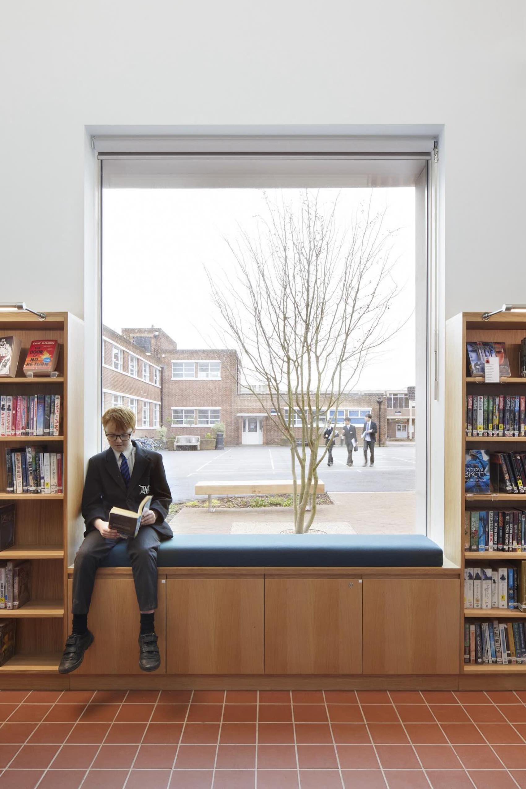 Large openings on ground floor offer views out of the library and animate the façade, permitting the public to see into the building while it is in use – a generous, and unusual move in school buildings. Externally, the building strikes a successful balance of informality and visual interest within the heritage context of the College.