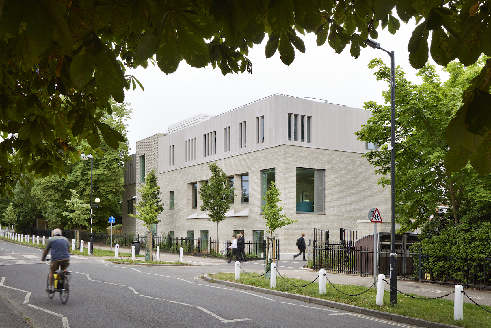 Externally, the building has a bold and confident external face. Of the collection of the school’s buildings along College Road, the Raymond Chandler sits closest to the pavement line, with an unapologetically contemporary external treatment, which responds to the uses beyond.