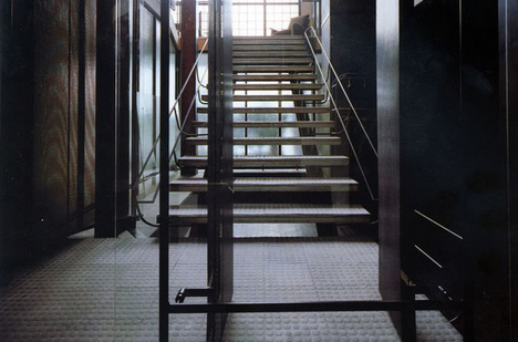 The salon continues the use of the industrial aesthetic with grey-studded flooring and metal-framed bult-in furniture. A bookcase occupys the entire wall opposite the staircase along with bookshelves that double-up as balustrading. The salon’s upper gallery is open but with three-quarter height storage cupboards held on a steel lattice, with metal elements generally being painted black.