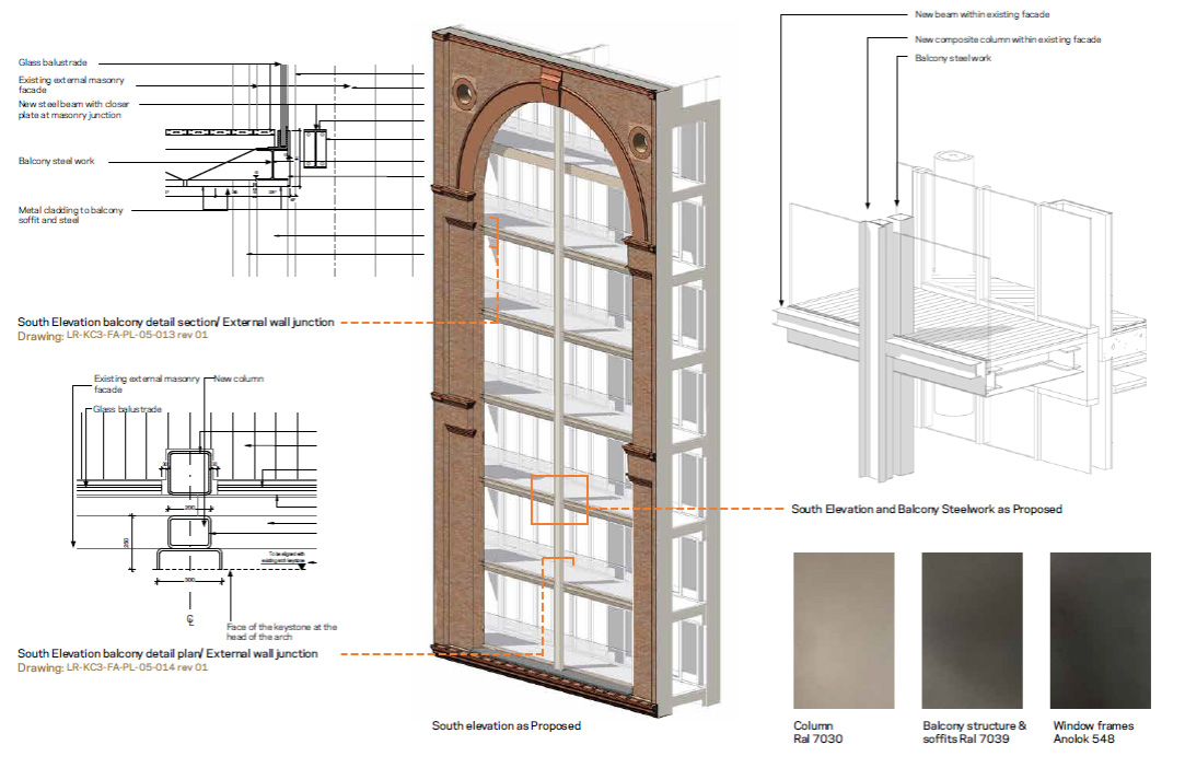 Original ironmongery and mullions were shot-blasted, repaired or recast using 3D scans, while decorative fascia panels were replicated in cast aluminium. The process combined meticulous heritage detailing with modern engineering rigour — including the design of new structural supports to manage differential movement between the retained façade and new frame.