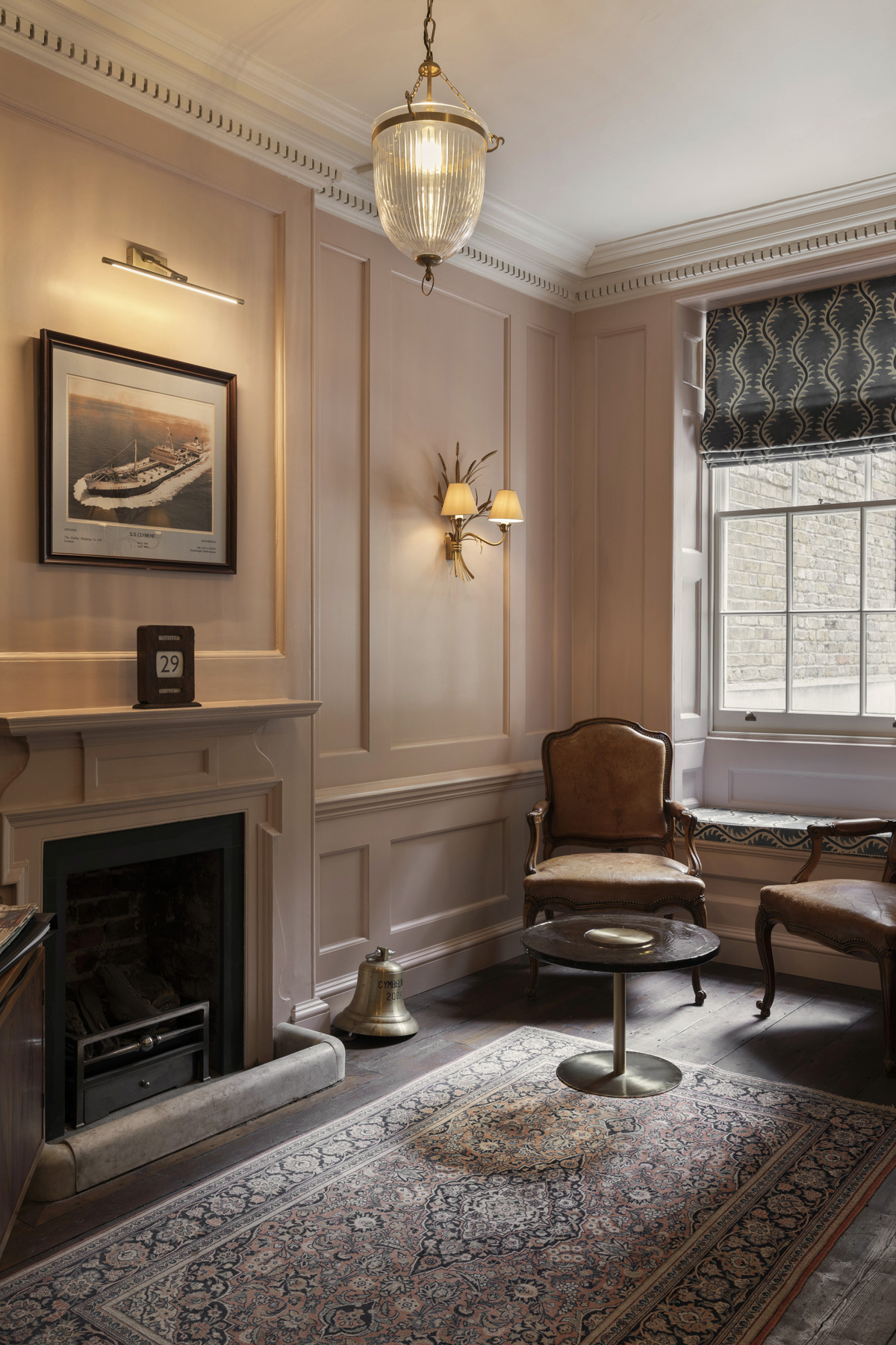 The reception space, with its vintage desk and fireplace, sets the tone as a light and welcoming threshold.