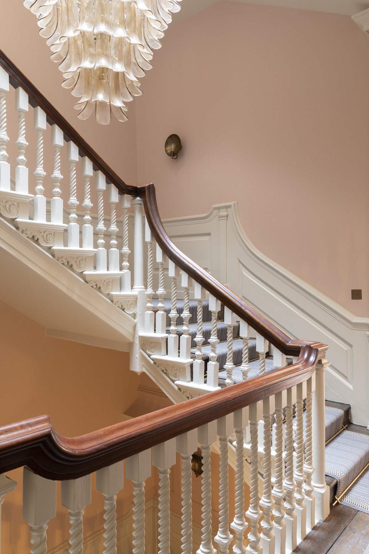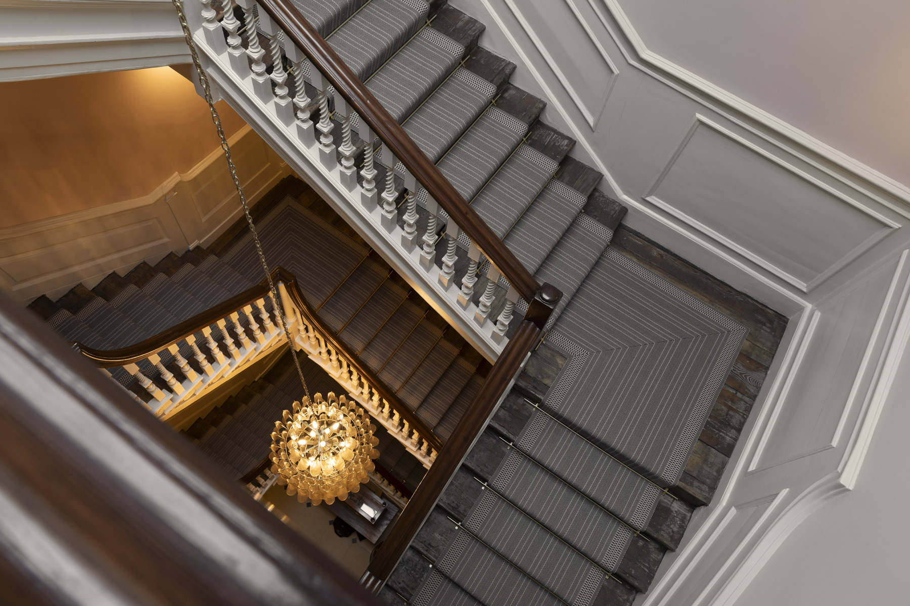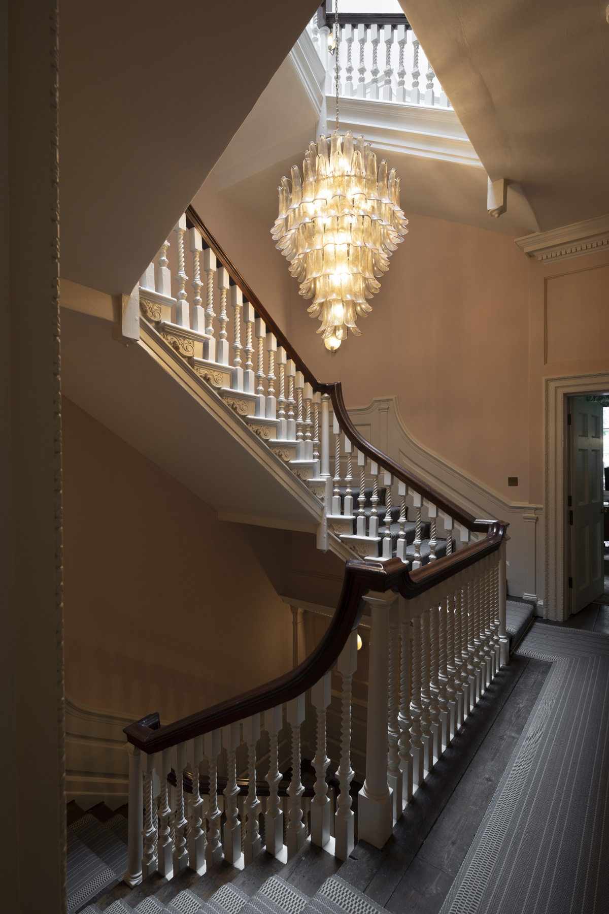 The building’s five storeys are organised around a grand central staircase, which rises beneath a restored roof lantern. A contemporary glass chandelier hangs within the stairwell, drawing daylight down through the building’s staircase, historic drawings of which, originally published in the architectural press, informed its careful restoration.