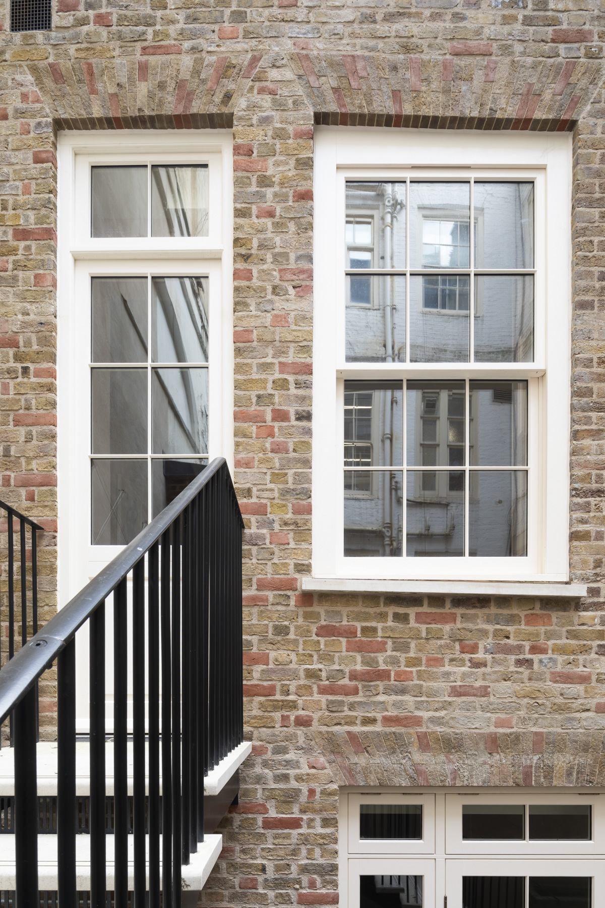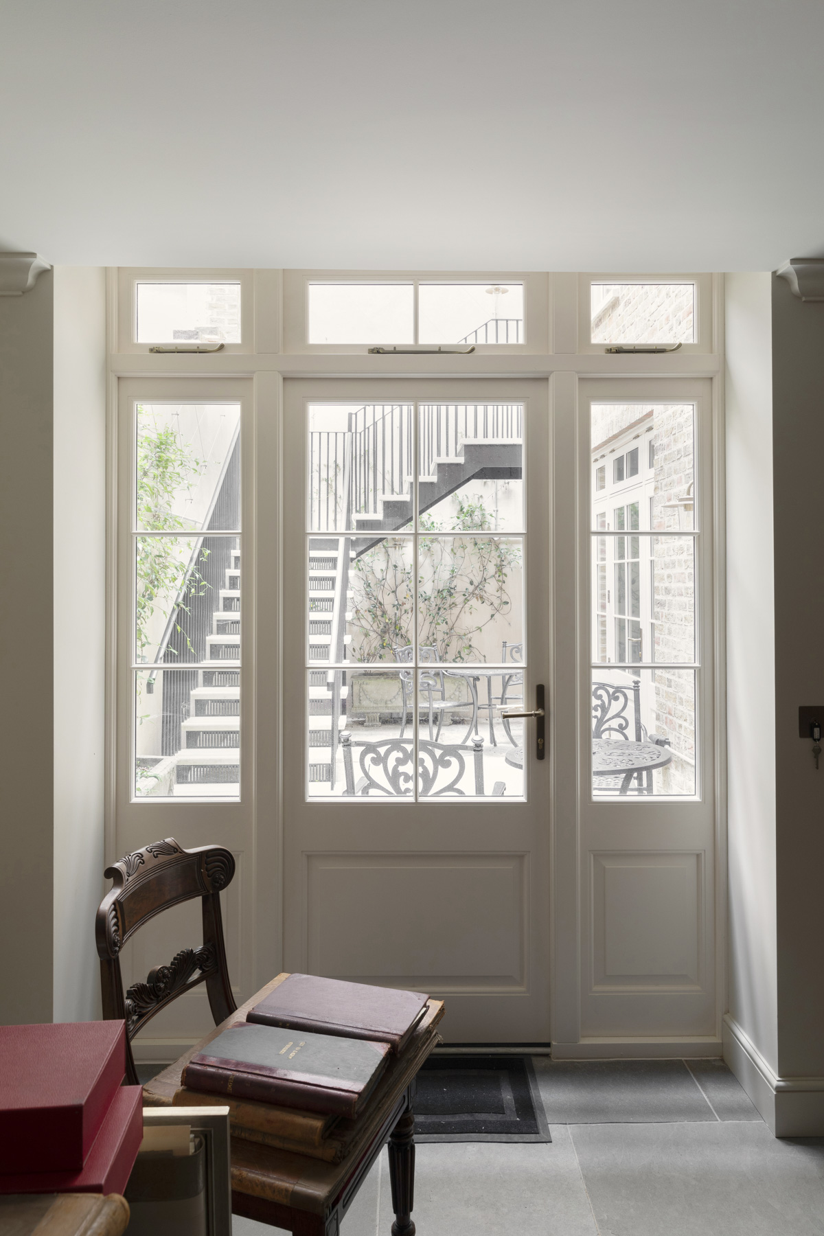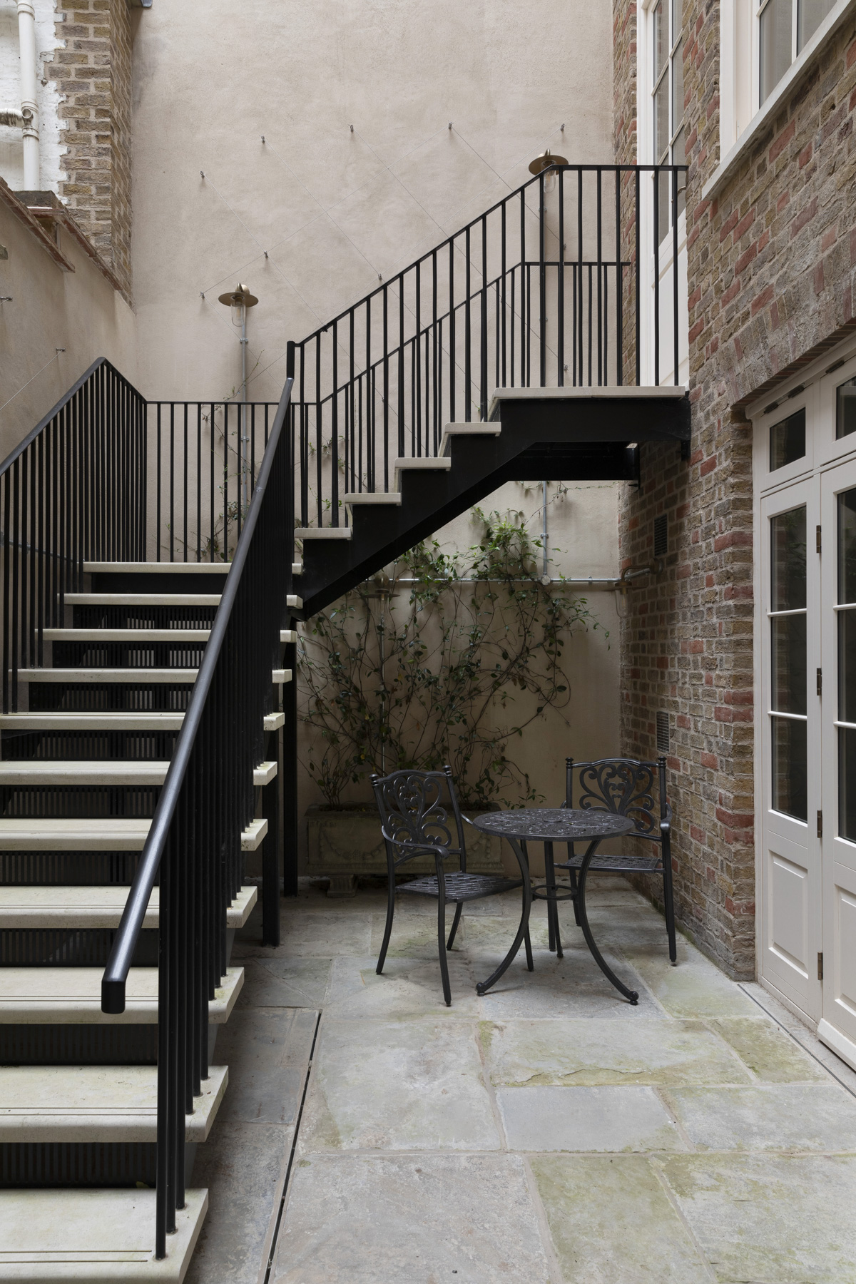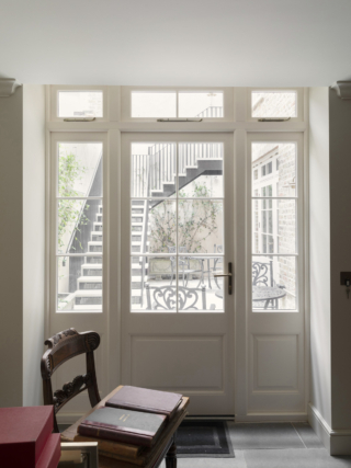 Externally, the project has re-established a relationship between the building and its rear courtyard. Later outbuildings have been removed and the façade repaired, with layers of paint stripped back to reveal London stock brick, allowing the walls to breathe. New planting has also been introduced to create a sociable outdoor space for the lower ground-floor offices, directly accessible from the kitchen.