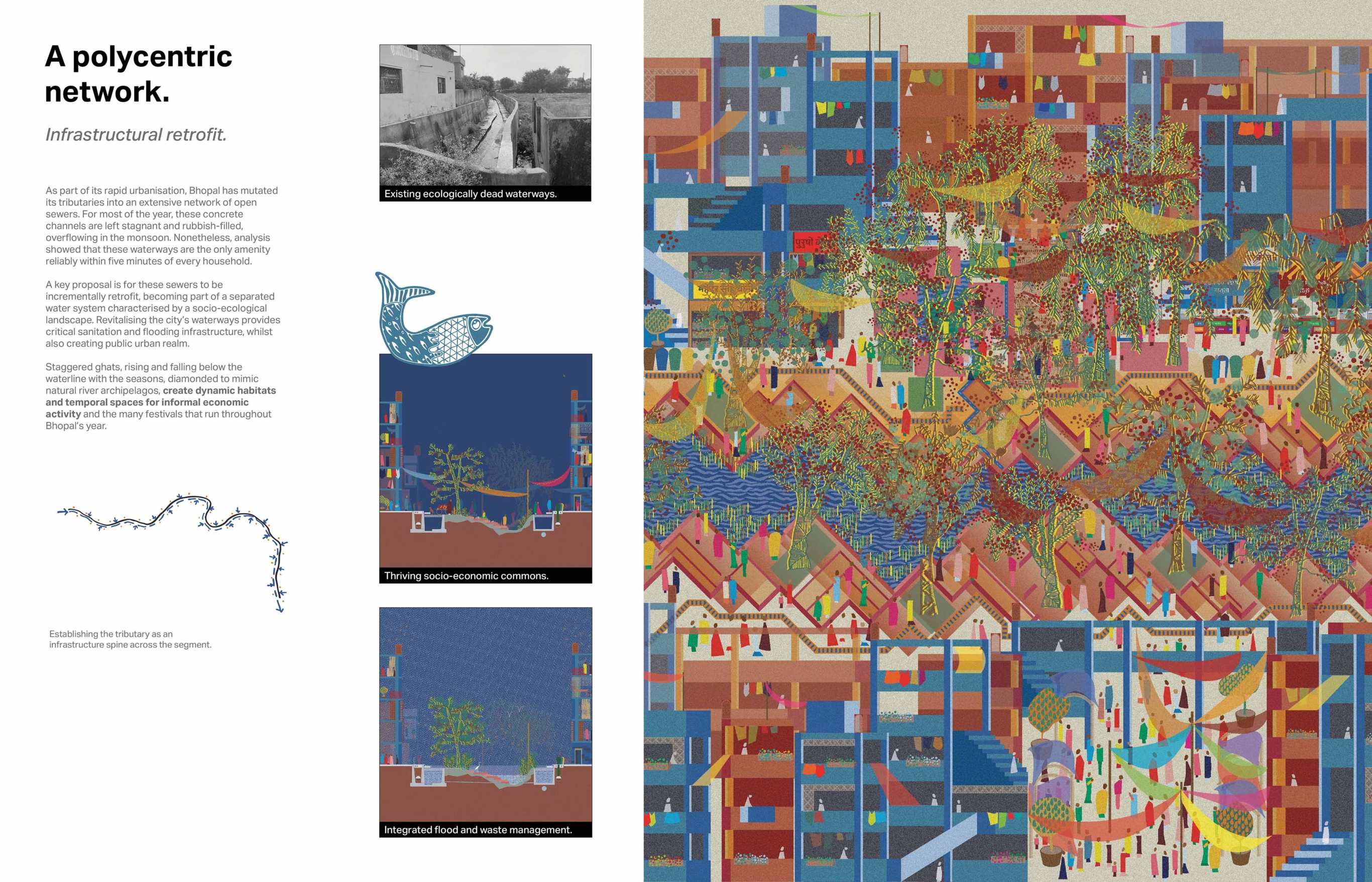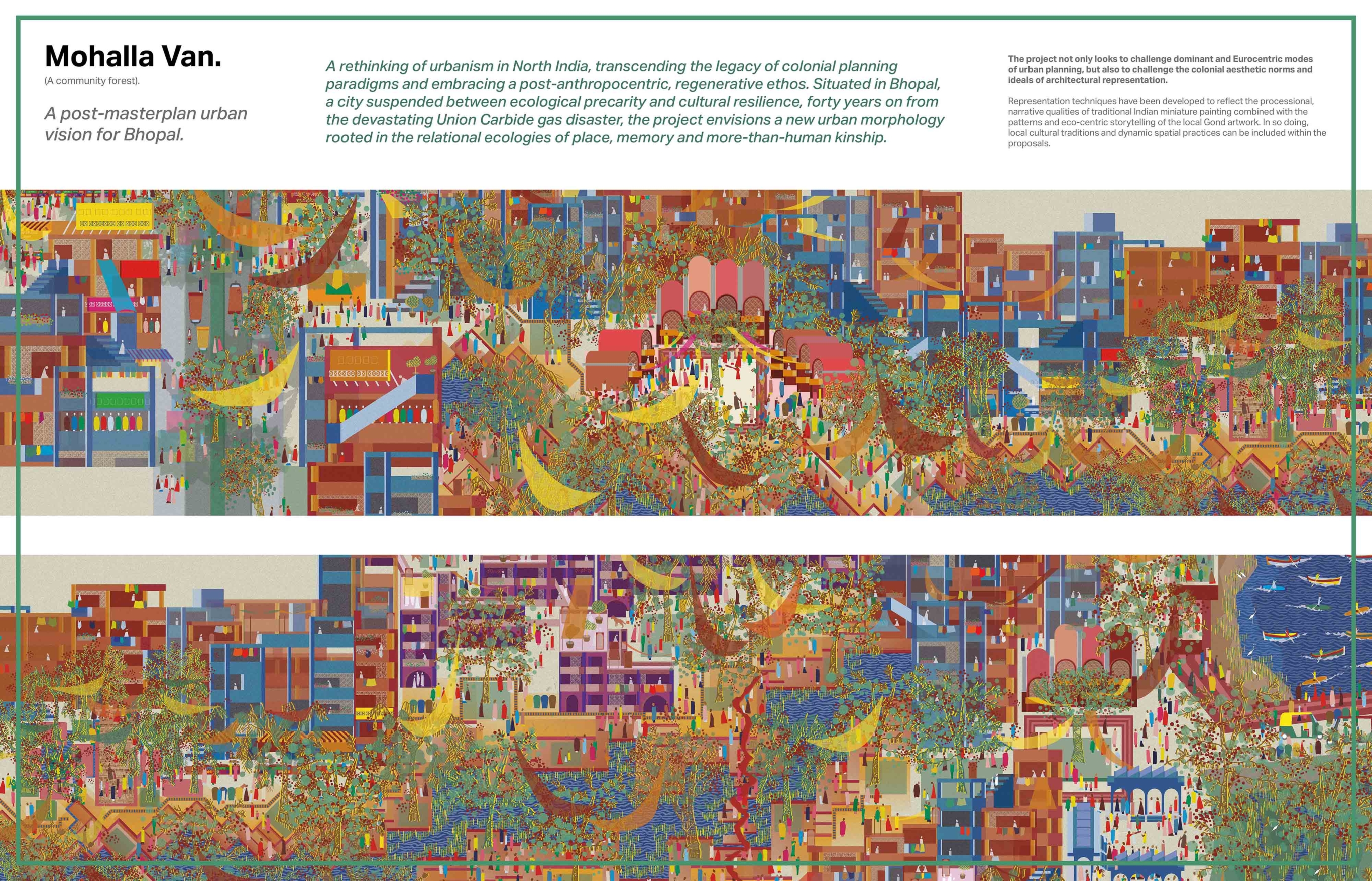The Part 2 Serjeant Award for Excellence in Drawing went to Joel Boyd, Siena Cornish, Jamie Ferguson, Benjamin Hanger, Beth Kippin, and Marco Lin for Mohalla Van: A post-masterplan urban vision for Bhopal.