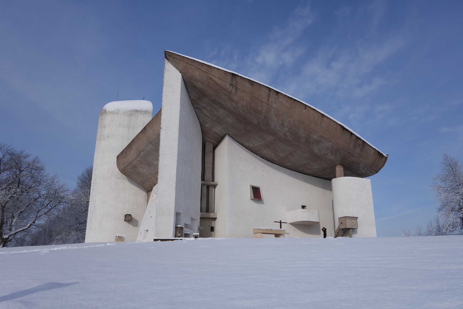 Ronchamp in the snow. (Credit: מיכאל יעקובסון via Wikipedia Commons)