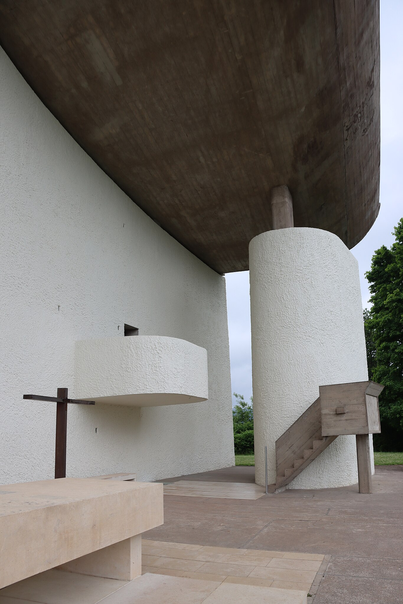 Outside, on the east flank the concave wall is capped by the convex roof hull, creating a large, covered space, an outdoor chapel with altar and pulpit to serve several thousand pilgrims on the broad hilltop.