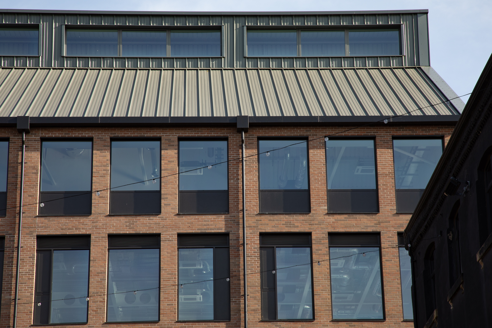 Combining a slim frame with strength and thermal efficiency, Senior’s popular SF52 aluminium curtain wall system has been installed to the ground-floor level alongside robust PURe® Commercial Doors that provide safe and secure access to the building. On the upper floors, large glazed openings have been created using Senior’s low U-value PURe® aluminium windows which help to minimise heat loss and flood the offices with natural light to create a more comfortable interior space. Smaller window units have been installed to the top floor, which is open to the underside of the steel truss roof, echoing the character of the adjacent mill buildings and providing a dramatic, light-filled workspace.