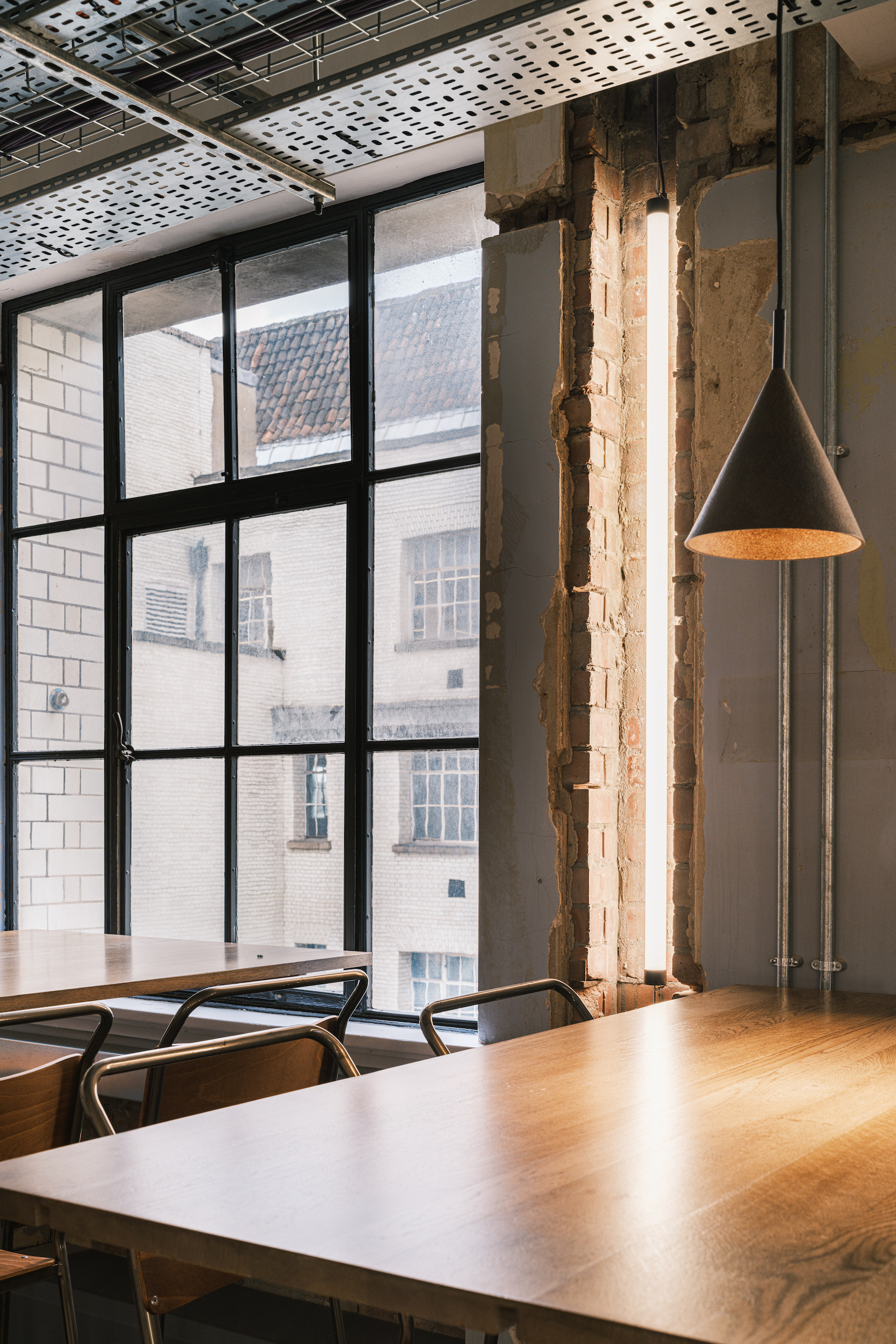 Designed by Material Works Architecture, Sustainable Workspaces at County Hall occupies part of the grade-II listed, former GLC headquarters on London’s South Bank, and comprises private offices, event spaces, innovation labs, cafés and break-out areas. The existing space had been untouched since the GLC left in the 1980s, providing a unique context of distressed historic finishes as the backdrop for the new works.