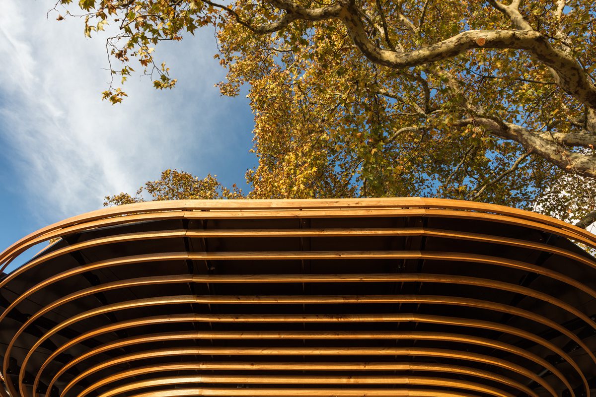 The flagship Horse Shoe Bend kiosk in St James’s Park, in view of Buckingham Palace, will be clad in tubular brass and mirror the ornate precious metals that adorn Thomas Brock’s Queen Victoria Memorial, while the choice of timber cladding for the rest of the kiosks rests on the relationship with the park environment. Tom Raffield is steam-bending the oak cladding. High quality materials have been used throughout the design, from sustainable oak to oxidised copper, new copper, stainless steel and brass.
