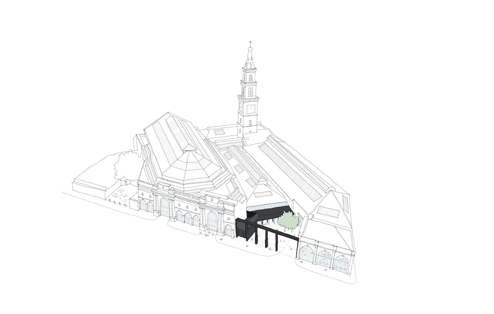 A courtyard entrance adjacent to the original stone façade provides accessible entry to all three halls via an internal lobby. All accessibility improvements have been constructed in high-quality materials chosen for their longevity, with their finish and colour carefully selected to provide good visual contrast. The much-needed fabric repairs have been carried out in tandem with carefully detailed thermal upgrades to the structures and roofs. Ultra-thin insulation is used in the roofs to thermally regulate the space without altering the roofline externally, and maintains the lattice of exposed iron trusses internally. The modern frosted roof glazing has been replaced with double-glazed patent glazing, bringing more natural light into the spaces whilst also improving thermal performance.