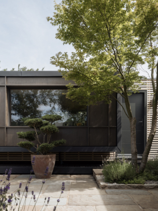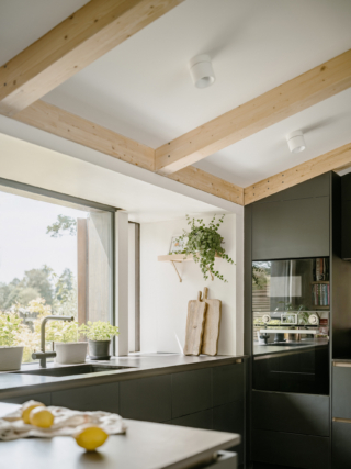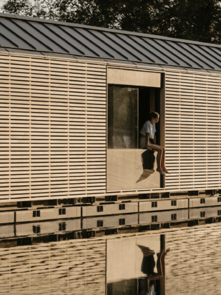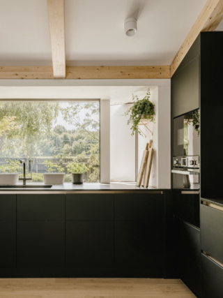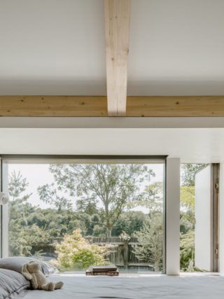 Externally, the house is clad in horizontal Accoya timber slats – chosen for their durability, low maintenance and weathering character. Cantilevered window bays extend beyond the linear plan, adding space for kitchen worktops, sleeping niches, and built-in seating, as well as providing ventilation and solar shading. They also form a distinctive rhythm to the bankside elevation and strengthen the home’s connection to the landscape.